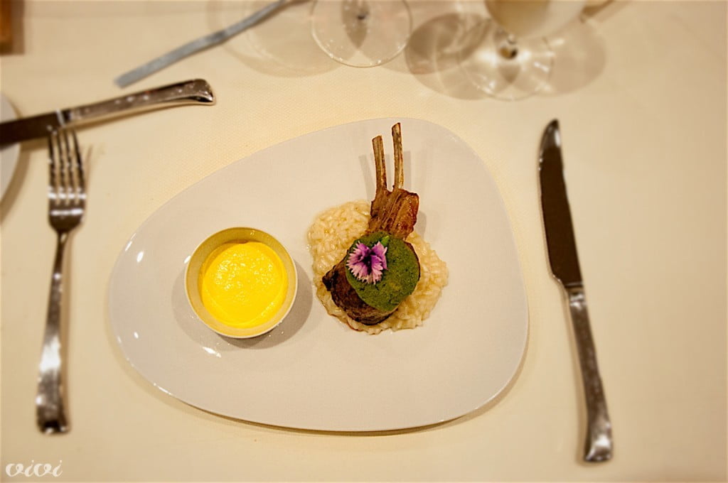 Jagnječji hrbetJagnječji hrbet v zelenih drobtinah z žafranovo kremo in rižoto z ovčjim sirom, staranim v tropinah maraške. Tri jedi v eni, ki pa jih je chef uspel sestaviti v celoto. Opus One, Oakville, ZDA, 2006.