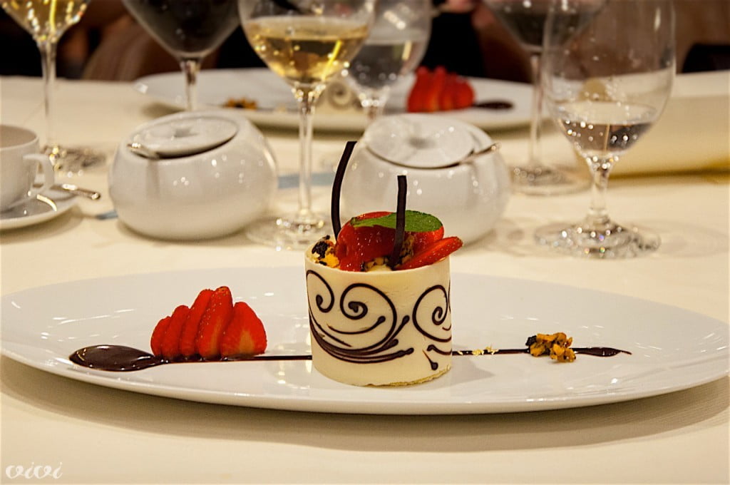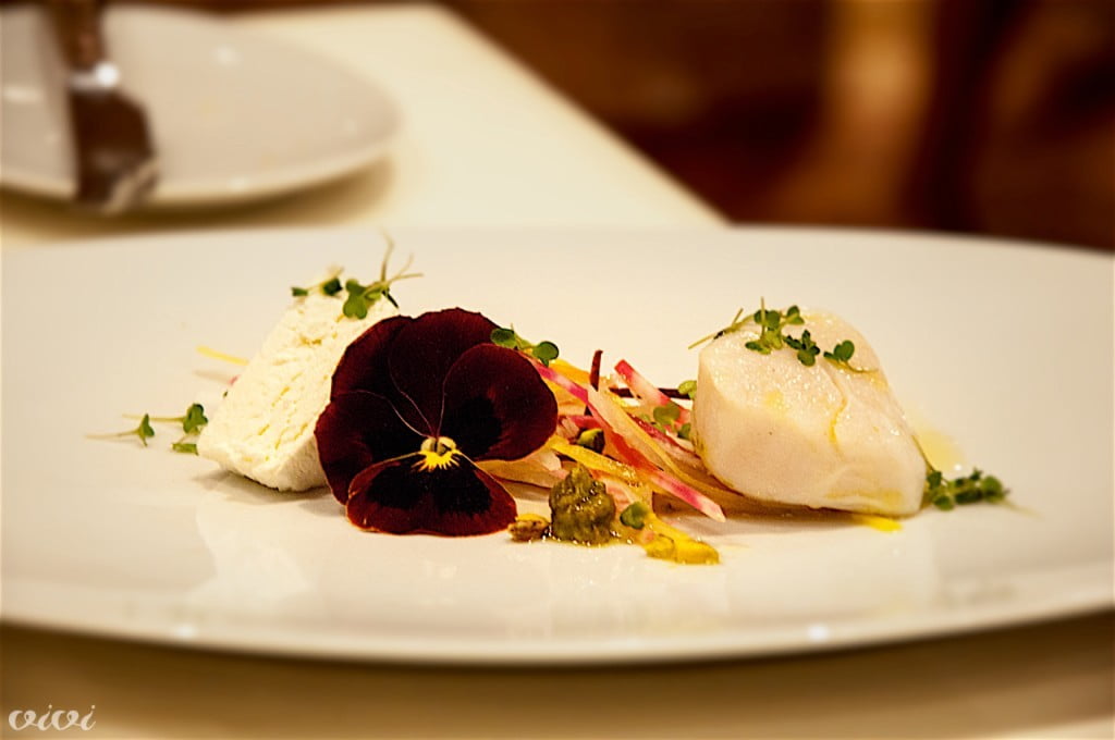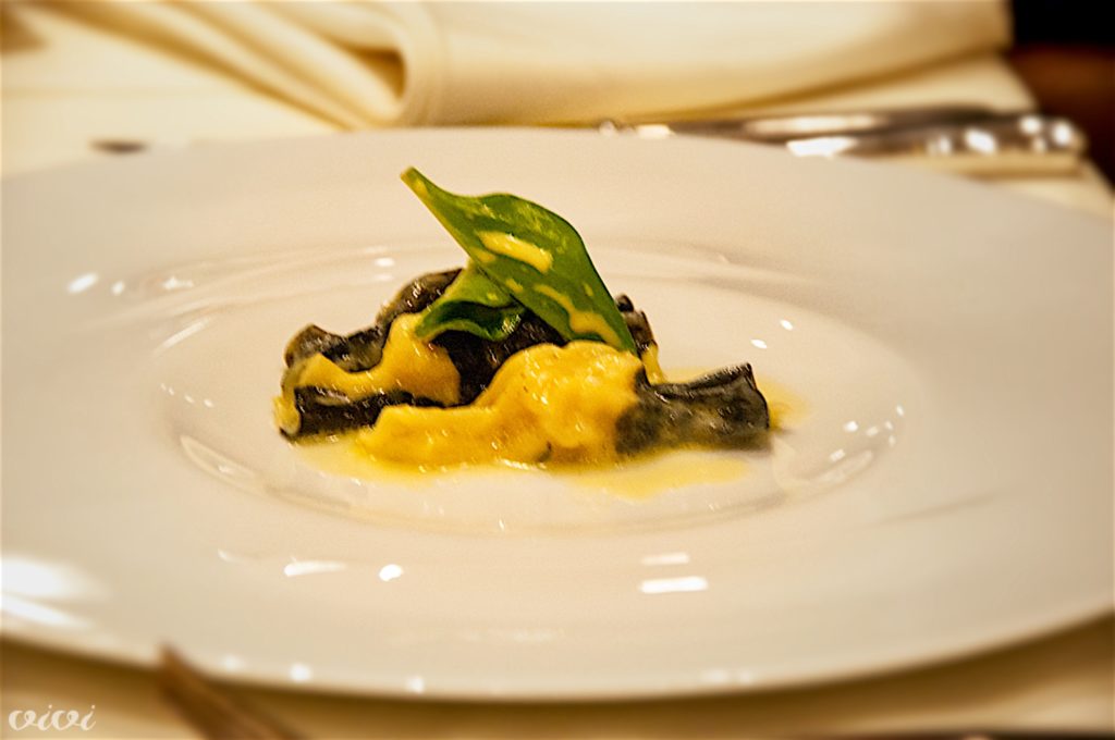 Karamele z rakovicoMarmorna pašta, črno-bela, zvita v bonbone, polnjena z rakovico, v masleni omaki z žajbljem, dopolnjena z okusom ostrige iz krešine solate. Najboljši krožnik večera, zelo iskren, eleganten zaradi preprostosti, s poudarjenim nadokusom morja. Vinska spremljava: Pouilly Fuissé, Louis Jadot, Maconnais, Francija, 2014.