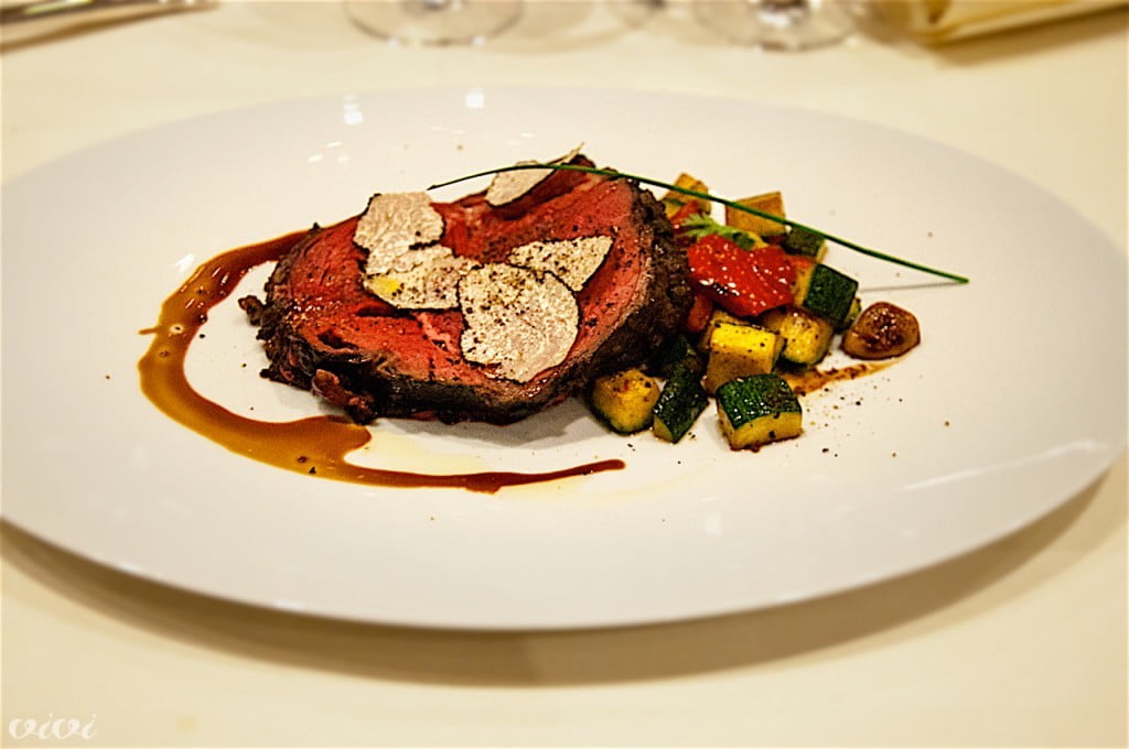 Ribeye in tartufRibeye s farme Creekstone, poletni črni tartuf, pečena zelenjava z okusom staranega kisa. Vino je potrebovalo takšen kos, ni pa ga potrebovala tako dolga večerja. Opus One, Oakville, ZDA, 2005.
