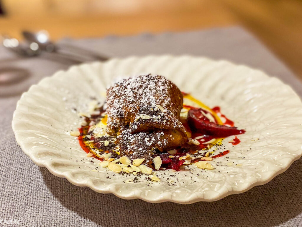 Smetanov praženec z makom, s sadno omako iz vinogradniških breskev, vanilije, karamele in orehov. Še ena klasika po chefovo.