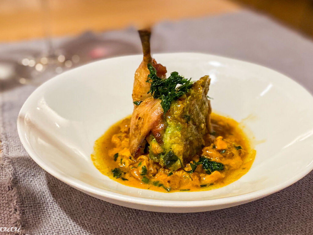 Domač piščanec iz pečice na drva, polnjen s kruhovim nadevom s koprivami, z omako iz lisičk z rožmarinom. Kot doma, kjer pa ni tako dobro kot pri Csencsitsu! Hit, zaradi katerega na zemljevidu poiščeš Harmisch. Enostavno dobro!
