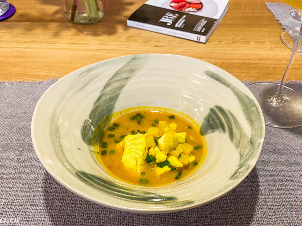 Fiš paprikaš na fino. ”Paprikaš” s koromačem, curryjem in kolerabo, riba pa smuč. Poklon ribi, ker je dovolj dolgo živela, da je dovolj zrasla. Ni Halászlé, je pa zato Csencsitsova panonska ribja juha. Vseeno bi vsaj malo več pikantnosti naredilo ”čudež”.