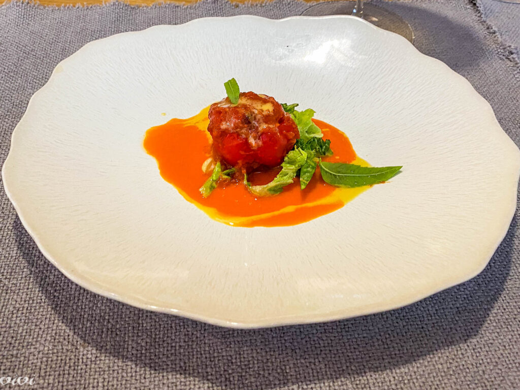 Omaka rdeče paprike, paradižnik polnjen z lečo in zlatovščico. Dobra zamisel, a v izvedbi je nekdo pozabil na smuča (v nadevu je le okus in konsistenca leče). Zato si zapomniš vsaj omako (papriko).