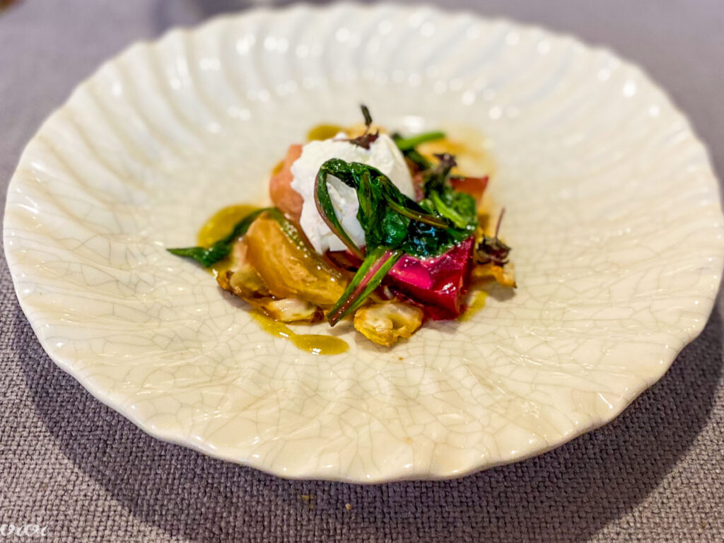 Pestrost redkve, ki je rdeča, črna ali redkvica, kuhana, pečena ali okisana, z blitvo, mladim zeljem, ovčjim sirom in sezamom. Iskreno in natančno ohrani (nad)okus sestavin v okusu jedi.