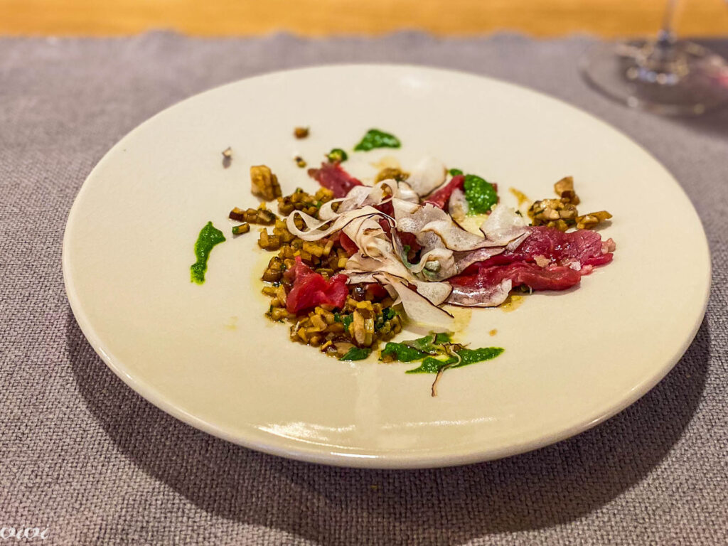 Suho zorjena lokalna govedina kot karpačo, s toplo gobovo omako iz jurčkov in timijanom. Prepoznavna Csencsitsova nadgradnja klasike, pri kateri surovi karpačo deluje toplo-mesno, topla omaka pa ga hladi-sveži. Le prezentacija …