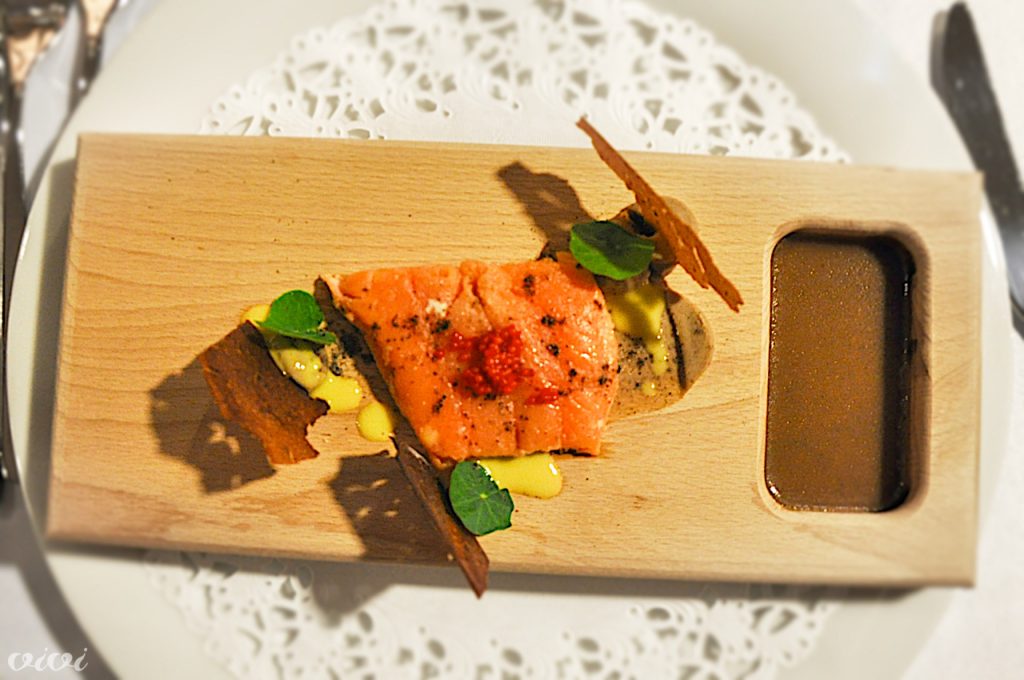Postrv in dashiPostrv (Aljaž Zemljič, Gostilna Grabar), prekajena z zemljišči, je dopolnjevala variacija kostanjev, kot krema, hrustek, kuhan kostanj v kozjem mleku. Posebnost je bil kostanjev dashi. Harmoničen, poudarjeno sortni šipon, 2015.