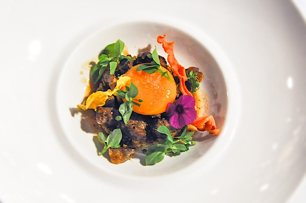Piščanec in jajceNa Ptuju ne gre brez piščanca. A Gregor Brodnjak zraven ni mogel brez pujsa … Piščančje želodčke je konfiral v svinjski masti, koruzne kosmiče je omastil s piščančjo kožo. Rumenjak je lepo popivnal maščobo. Malo manj soli, edino, prihodnjič. Chardonnay, 2013, se je razživel s hrano, ki ji je dodal ekstrakt (pre)zrelega grozdja. Morda pa je res bilo v cvetici tudi nekaj vinogradniške breskve, ki je že skoraj izginila iz štajerskih vinogradov.