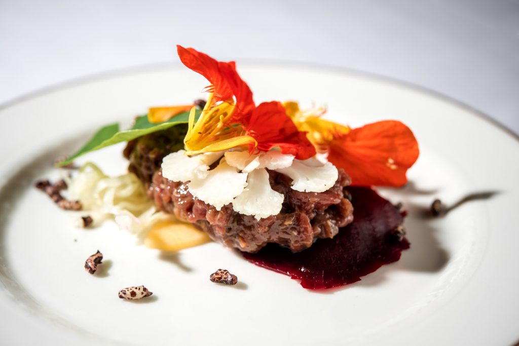 Ročno nasekljan srnin tatar, omaka jajčnega melanža, domača fermentirana zelenjava in kokice črnega riža