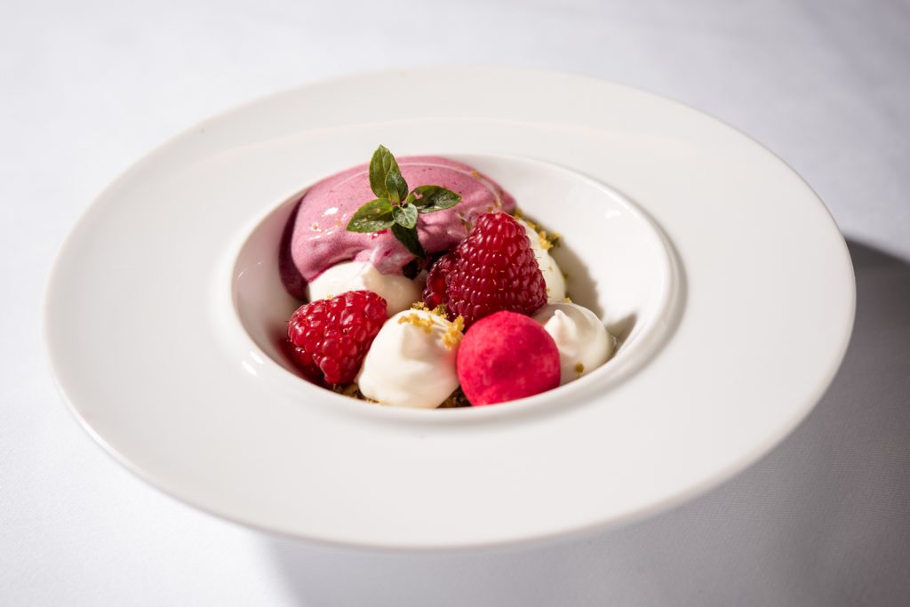 “Sladko – bučno”: pražena bučna semena in bučno olje, lahka krema domače skute, maline, jurka, meta