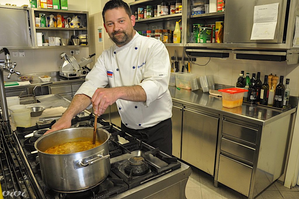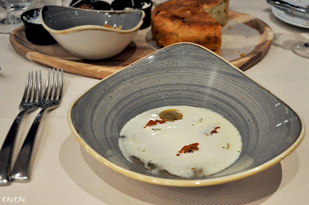 Goveja juhaGoveja juha, krema grojer sira, čips lešnikov, karamelizirana šalotka, pena goveje juhe. Močna nadgradnja. Potrebna domišljija, tudi jedčeva. ”Pa jo le imamo,” pravi chef, gost pa ne sme preveč brskati po spominu. Ne iskati goveje juhe kot jo poznamo in jo imamo v genih ter srcu. Razmisliti, da se svet spreminja in se moramo, torej, tudi mi z njim. Ko jo tako sprejmeš, je lepa igra okusov.