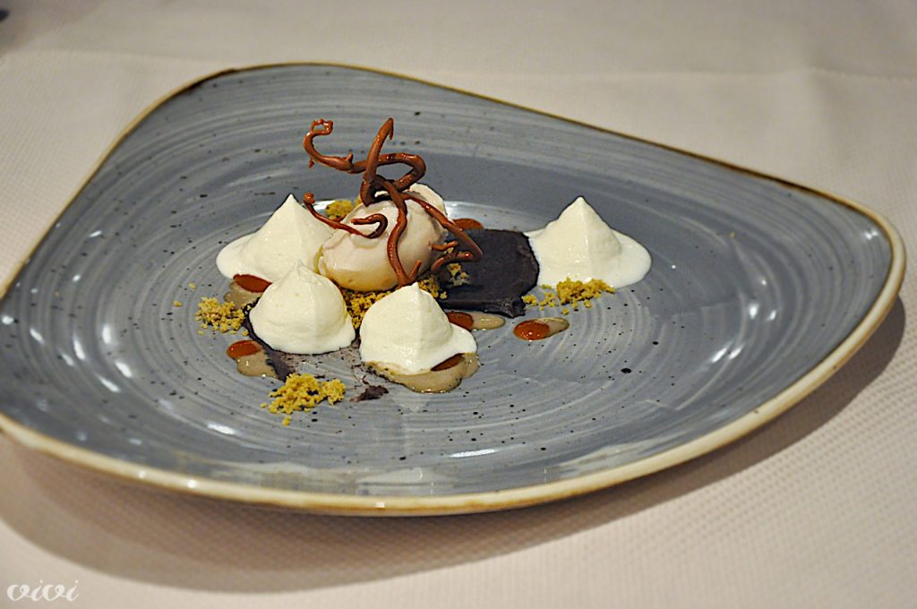 Brezov sladoledSladoled brezovih vej, pasta iz črnega fižola, pena iz reduciranega mleka, čokolada za povezavo, drobtine bučnega olja, s sezamom, timijanom, zvezdastim janežem in vanilijo začinjeno mleko v obliki žličnika. Sladoled je iz kompota (vode) iz pečenih brezovih vej, črni fižol je karameliziran in ”popravljen” z oljem iz slivovih pešk. A sladica ni le dokaz poznavanja tehnik in kuharske spretnosti, temveč je pravi zaključek chefovega menija, po katerem ne greš spat, ampak plesat.
