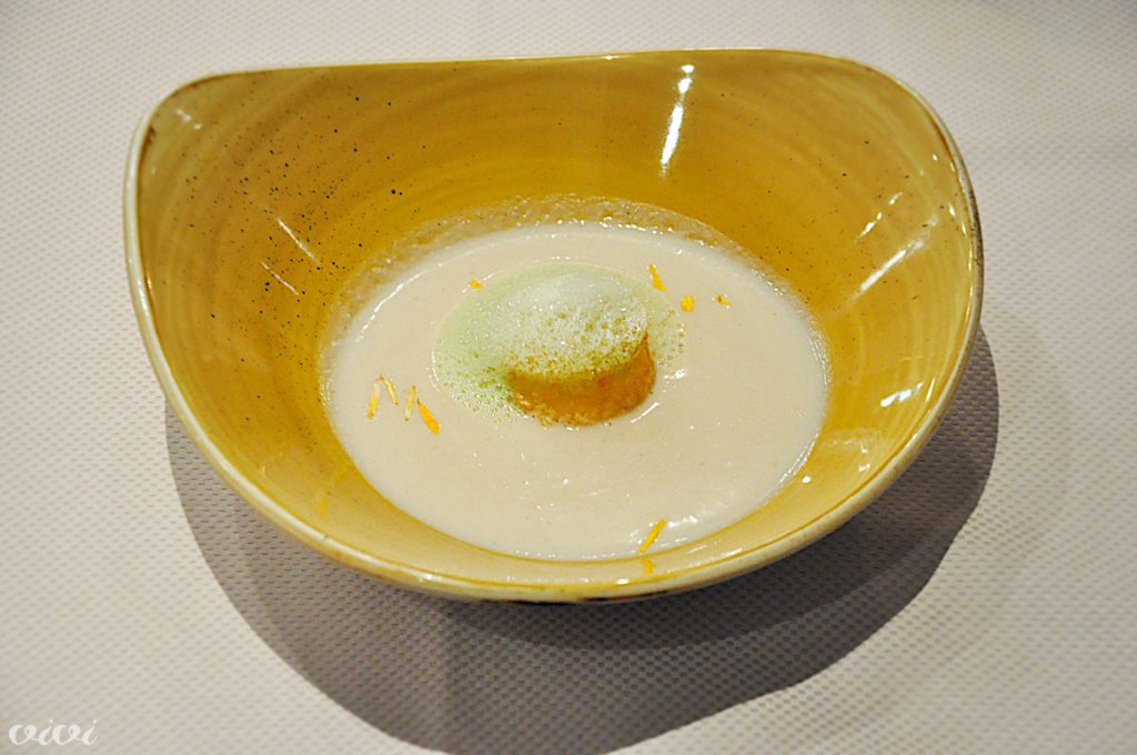 Cvetačna juhaCvetačna juha, pena iz soka zelenih špargljev, pomaranča za svežino. Ostaja cvetačna juha, v tem smislu je dovolj klasična in všečna, hkrati pa je tudi z nadgradnjo, torej chefovska.