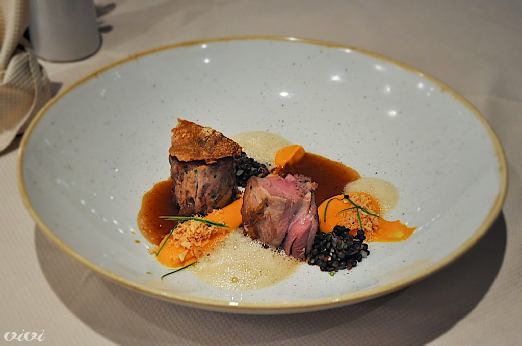 Jagnječja kračaKrača sous vide in v confitu, že videno, toda tukaj z nadgradnjo v obliki salse iz črne leče in jagnječjega jezika. Krema korenja, ocvirk račje kože, pena masla, vešča mesna omaka pomagajo. Nasploh, vse omake so chefovske, krem in pirejev je sicer veliko, a niso vsi enakega okusa, in zato jedec tudi po štirih hodih poje celotno mesno glavno jed, kar je največje priznanje kuharju.