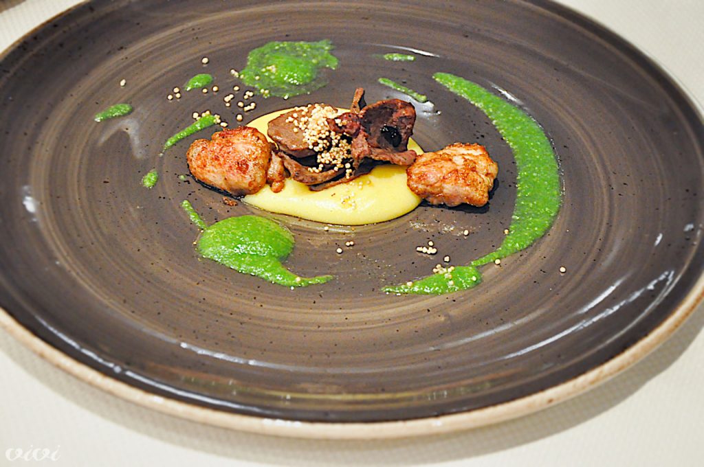 Jetrca in priželjcTelečja jetra z amarettom, krema polente, priželjc, omaka motovilca, kokice amaranta. Dovoilj chefovska izvedba znane jedi in znanih okusov. Tanko nalistana jetra, ki so tako hitro opečena, da ostanejo čvrsta, a že mehka. Veliko masla v polenti je preveč všečno in staro-francosko, čeprav priznam, da je učinkovito. Priželjc je zapečen, a lahko bi bil še bolj poseben, ”skorjast” (crunchy). To sicer opravijo kokice, ki pa jih komaj opaziš. Je pa solatna omaka dodana vrednost jedi.