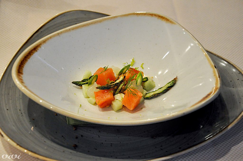 LososDimljeni losos, brinove jagode, žele tonica, maslene drobtine, šparglji, kompresirane kumare. Glede na omembo Poličarjevih postrvi bi te lahko zamenjale lososa. Sicer pa jed naredijo dodatki, ker so šparglji nalistani, popečeni, hladni, ker je kumara del uspešnega nadokusa, ker je žele uspešna ”začimba”. Nežen uvod, ki vzburja domišljijo. Kaj še pride?!