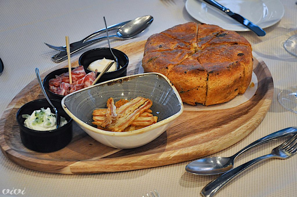 Pozdrav iz kuhinjeSveže pečen (dopeka) hlebec olivnega kruha, skutin namaz s čebulo in medom, gospodarjeva panceta, kozja skuta s kumaricami za svežino, postrv iz Poličarjeve ribogojnice, z domačim testom, stisnjena in sušena v ”panceto”.