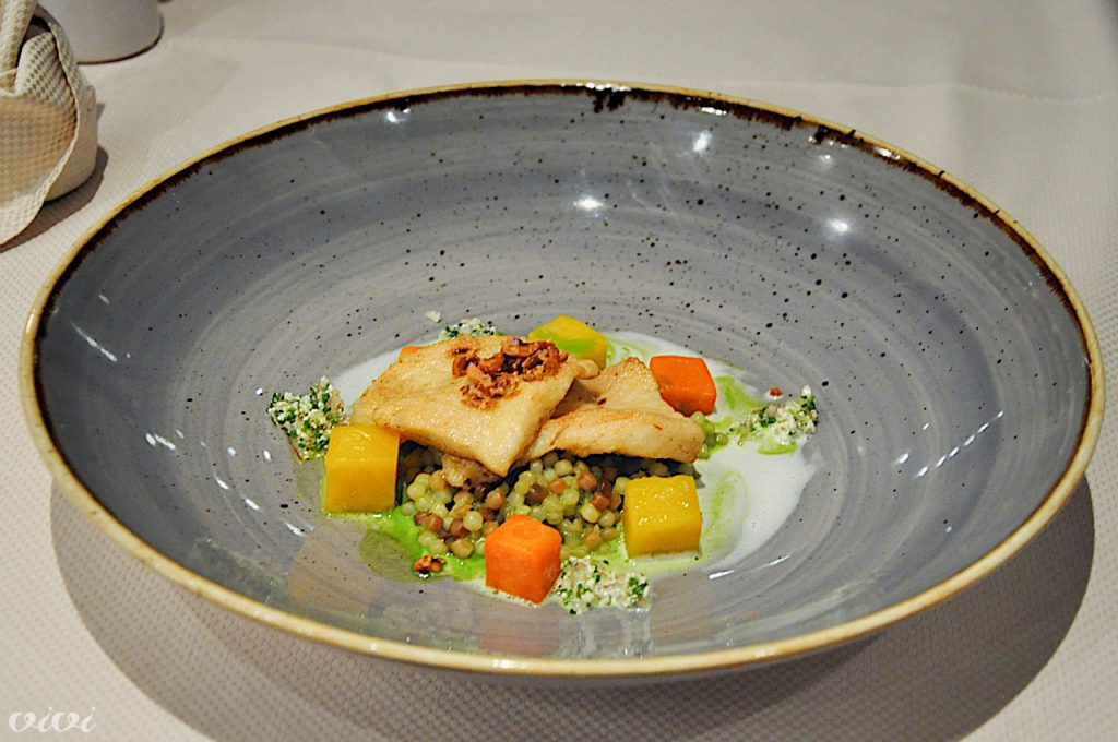 Romb in fregolaFile romba, fregola s kremo špinače, okrog krema špinače, penasta omaka pernoda, za svežino cvetačni kuskus z drobnjakom in limono, praženi lešniki s solnim cvetom, korenje.