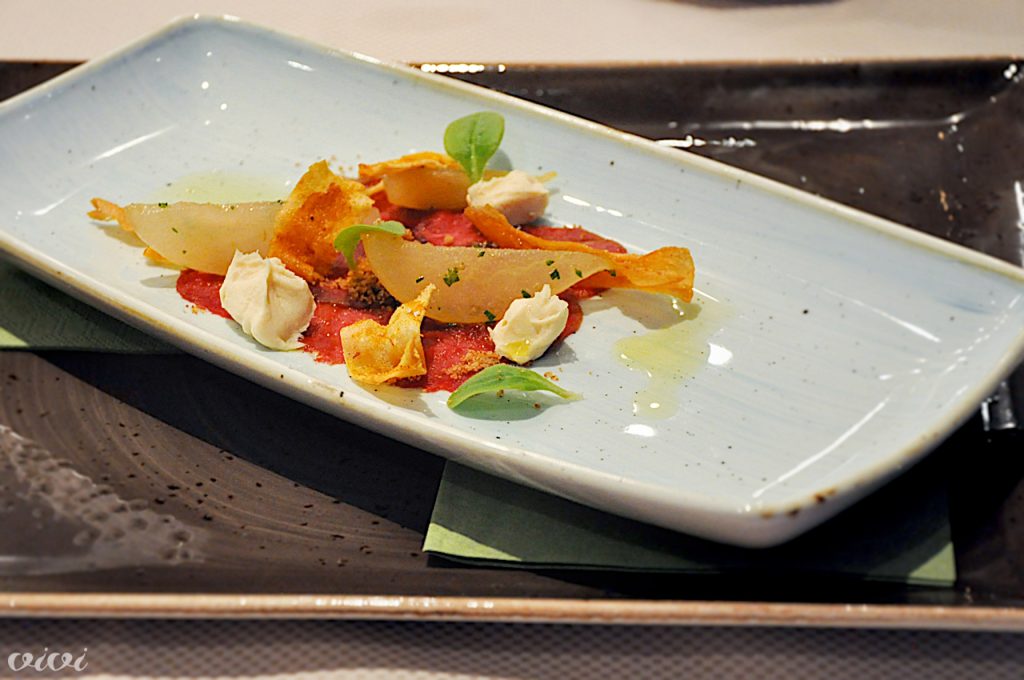Srnin karpačoSrnin karpačo, marinirana hruška, krema pastinaka, čips pastinaka, ječmenov drobljenec, olivno olje, solni cvet. Lepo, tudi dobro, čeprav hruška nad karpačom, ki le začinja sadno svežino, kar pa ni nujno narobe.