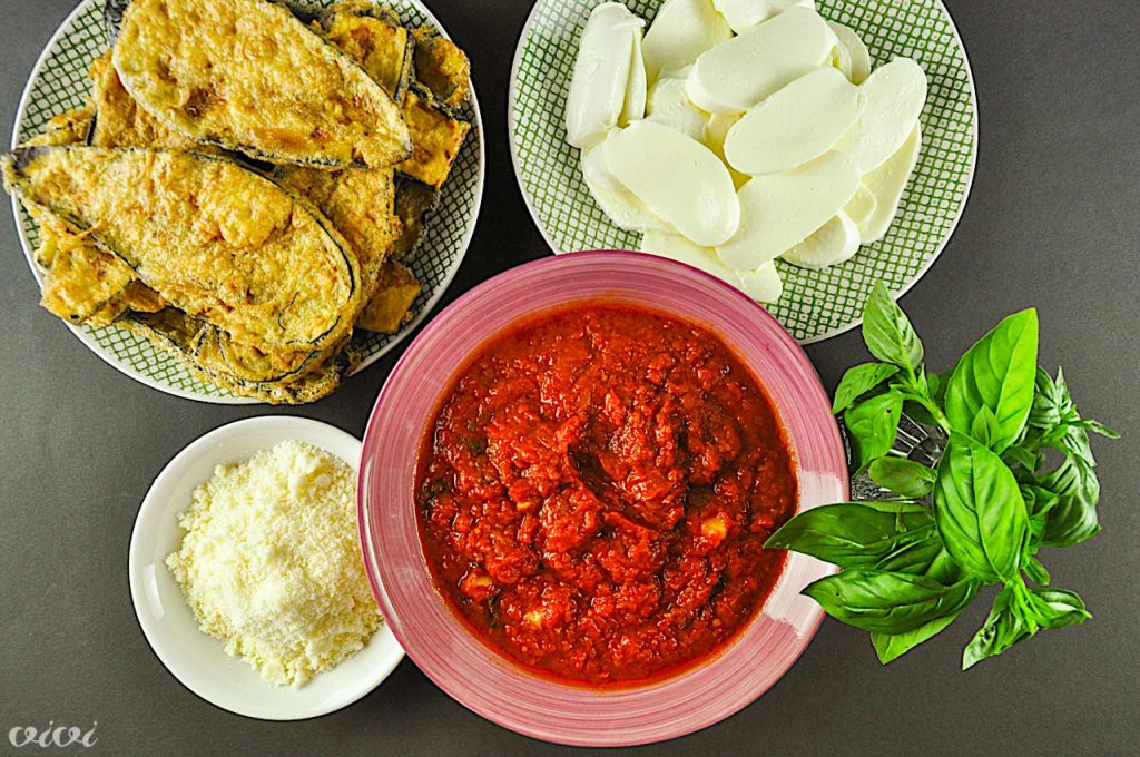 SestavineParadižnikova omaka, parmezan, mocarela in jajčevci, posoljeni, odležani, odcejeni, osušeni, pomokani, povaljani v jajcu in ocvrti.