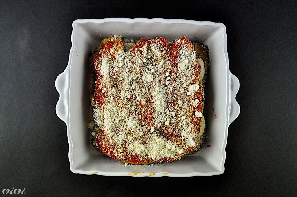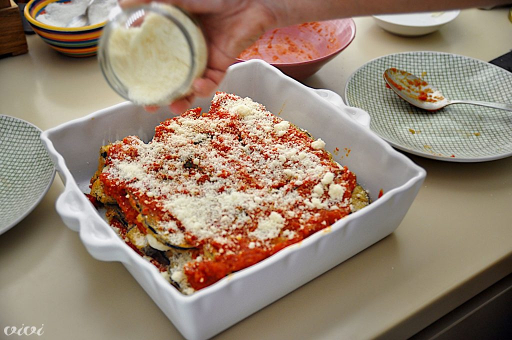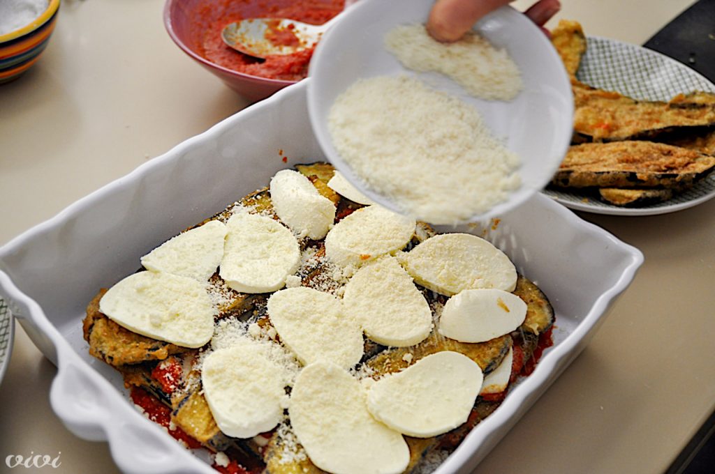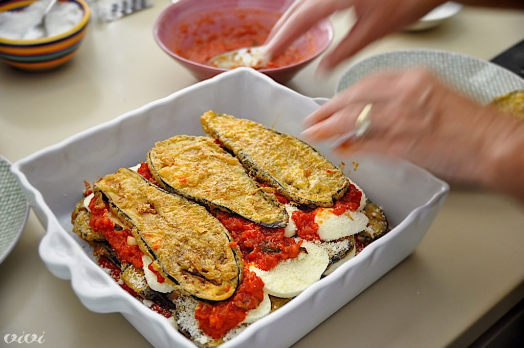 Vrstni redNa dno gre paradižnikova omaka, potem pa po vrsti, ocvrti jajčevci, mocarela, parmezan.