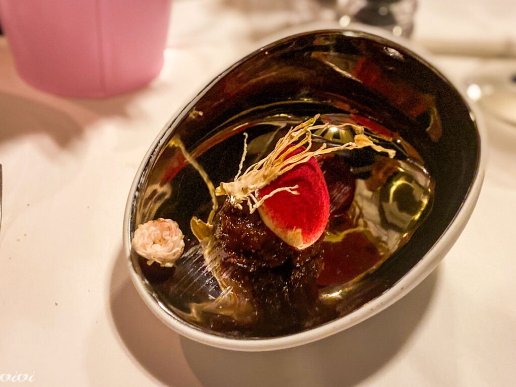 Presenečenje ”povratka” je quenelle, žličnik, oziroma cmoček iz gosjih jeter, polnjen s kremo iz škampov, barvno in okusno pa dopolnjen s prahom dehidrirane rdeče pese, gelom rdeče pese, in suhimi smokvami kuhanimi v cassis likerju s koromačem. Takšno drzno kombinacijo najboljše opišejo besede vinske svetovalke, namenjene spremljajoči malvaziji Simminor, 2018, Dobravca iz Rovinja: ”Prašna, mineralna, živahna!”