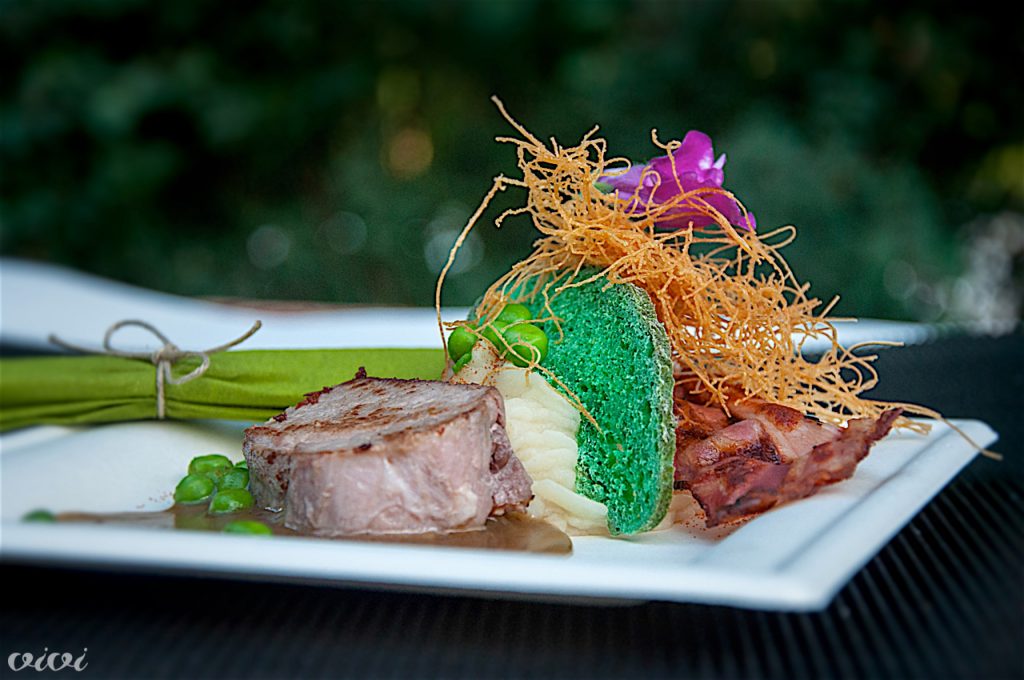Dimljen telečji hrbetBoštjan Pavli, Harfa: blago dimljen telečji hrbet pečen na nizki temperaturi s hrustljavčkom iz graha in vipavske slanine na kremi iz pečene gomoljne zelene in peteršilja s paradižnikovim prahom in brinovo omako s timijanom