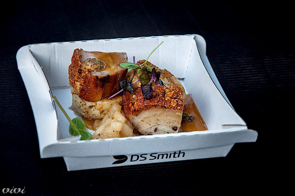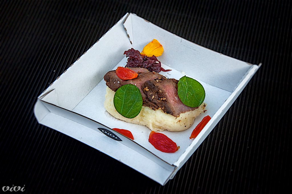 Harfa, LjubljanaBoštjan Pavli je za ulico priredil dve svoji ”fine dining” jedi, popečene morske sadeže in dimljen telečji hrbet. In ker slovenskega obroka ni brez kruha, ga je spekel kar pet vrst: sipin, paradižnikov, z goji jagodami, z lešniki in bučnimi semeni, čebulni!