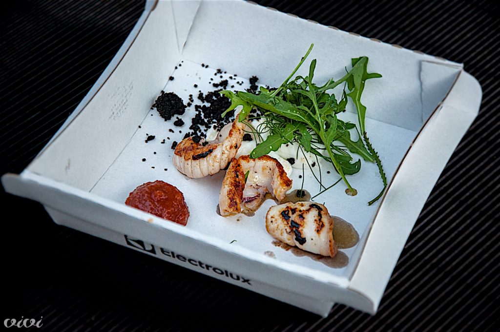 Lignji poletjaKristjan Anderlič, Sedem: lignji, mocarela, hišna paradižnikova krema, drobljenec črnih oliv, pena bazilike