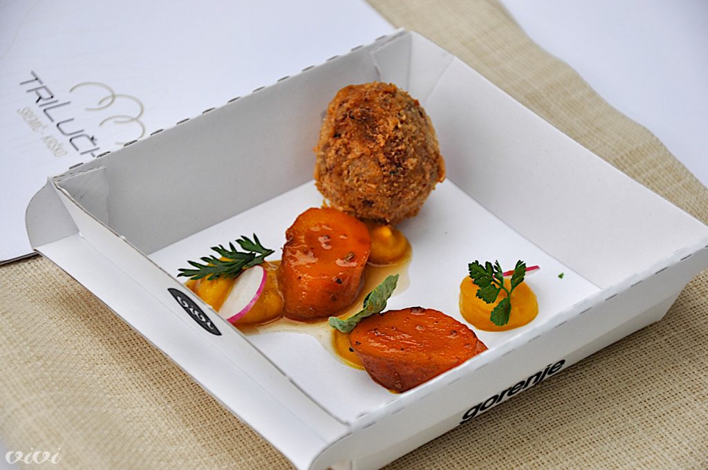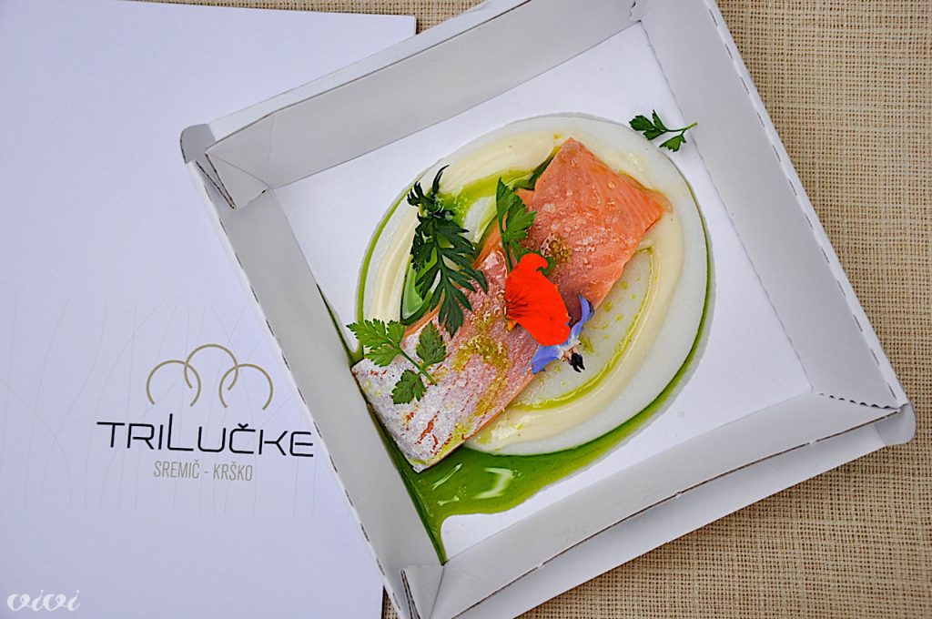PostrvAljaž Novšak, Tri lučke, Sremič: Goričarjeva rdeča postrv, koruza in mladi poganjki. Nežnost s pikantnostjo.