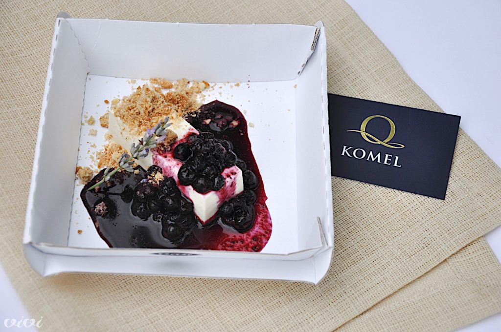 PanakotaSimo Komel, gostilna Kobjeglava, Štanjel: kuhana smetana s sivko in borovnicami. Dišalo je po panna cotti in Krasu.