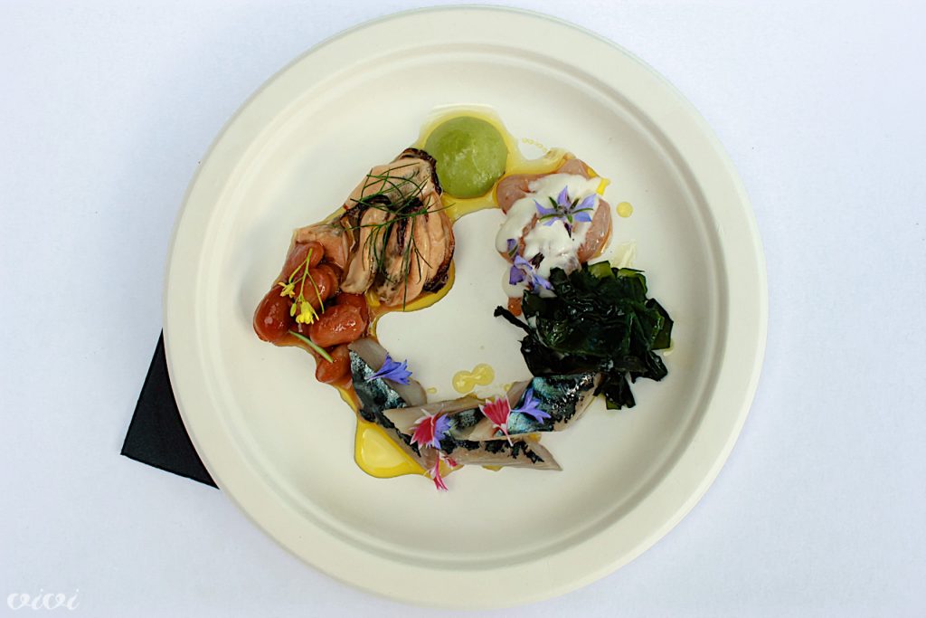 Morje in gozdLuka Košir (Gostišče Grič, Horjul): “Surovo morje in gozd”. Skuša, jadranske kozice in klapavice, omak iz kapucinke in kislice ter omaka iz ovčjega jogurta in hrena, alge wakame in fermentiran fižol.