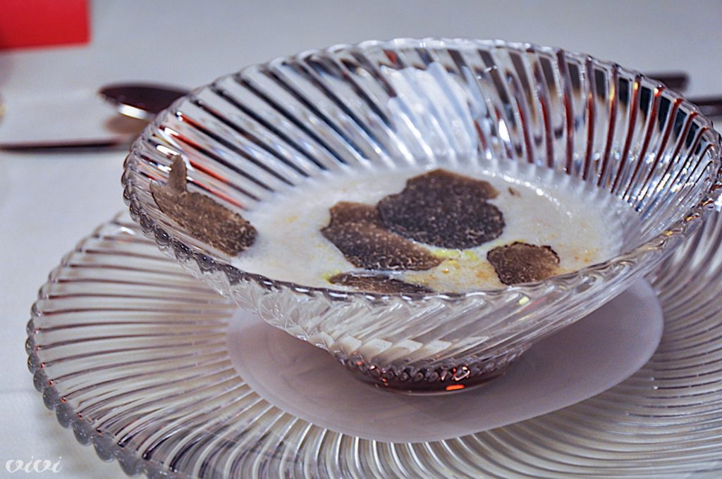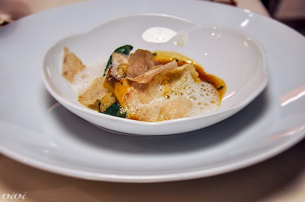 Pozdrav 2Tudi kostanjeva juha, naslednji chefov pozdrav, je takšna, četudi s črnimi zimskimi tartufi. Nobenega bahanja, vse je umirjeno, sproščeno, prijazno, toda elegantno, dovršeno, vrhunsko. Postrežba je smehljajoča in v juhi je sipa, ki pove, ko jo grizeš, čeprav se kar topi, da bo prijeten večer.