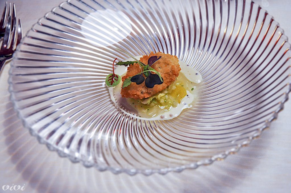 Pozdrav 1Krožniki so kristalni in rebrasti, tako da še bolj zrcalijo barve stropa in sten, ki so tako močne, da so rožnati šampanjski mehurčki iz magnum steklenice kot balzam, ki umirja čustva za mizo najbolj kričeče restavracije, kar sem jih imel čast obiskati. Ščukin žličnik pa je čisto nasprotje, sicer ocvrto hrustljav, toda na mariniranem kitajskem zelju prav nič domišljav in prevzeten, temveč zelo skromen in le – dober.