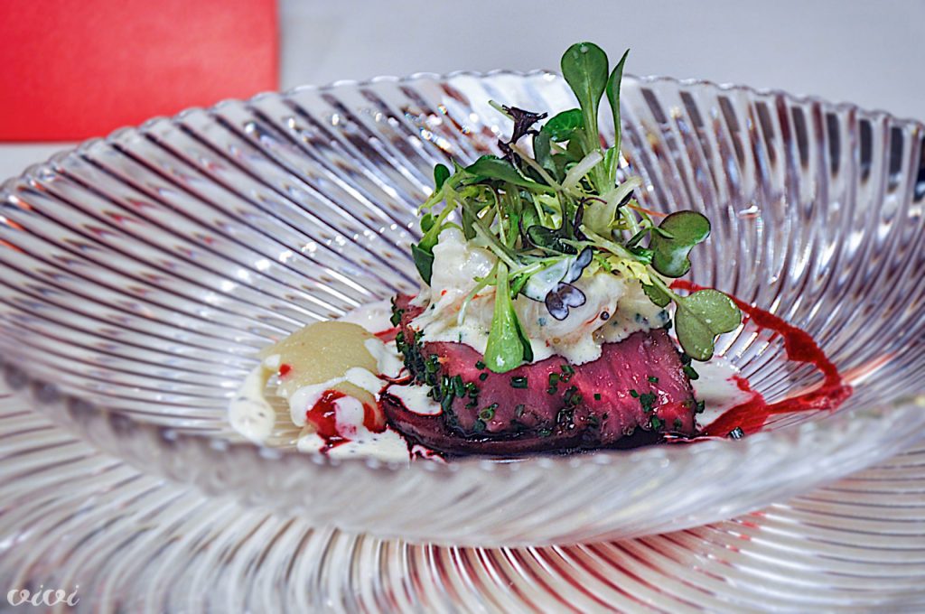 Rdeča pesaOb tuni in škampu je najboljša rdeča pesa, ker se ujema z obema. Gre za nianse tekstur, ki se uspešno prelivajo, tudi dobesedno, v ustih, ki so polna sočnosti pese, a vseeno zaznavajo temperaturo, ki je le ogrela tuno, in le objela rep.