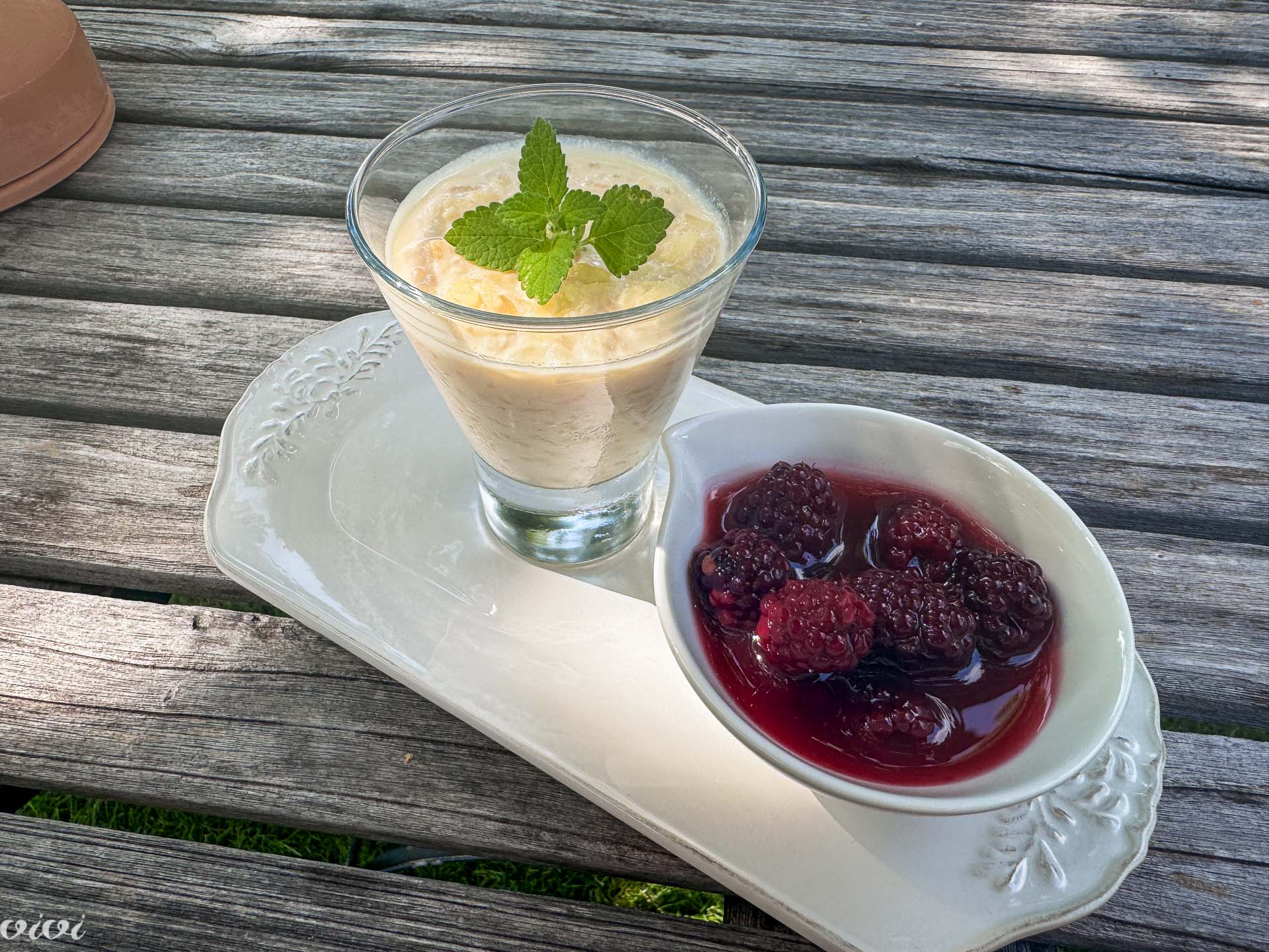 Za robidov kompot zavremo agavin sirup, pomarančni sok, cassis in bezgov sirup. Škrob gladko zmešamo z žlico mrzle vode in zgostimo marinado. Ponovno zavremo, dodamo robide, kuhamo 1 minuto, jih prelijemo v skledo in ohladimo.