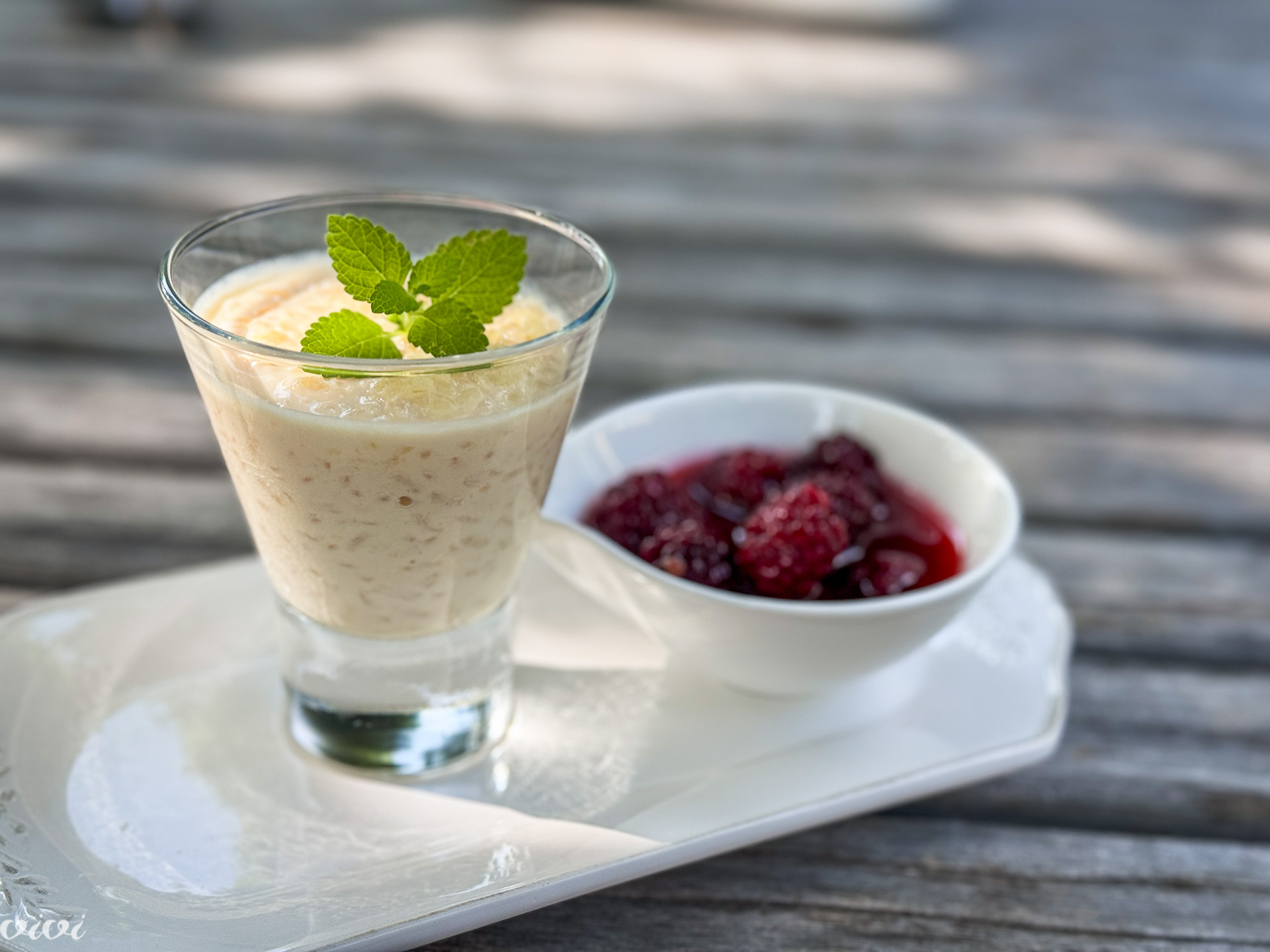 V loncu zavremo mleko, sredico vanilijevega stroka ter limonovo in pomarančno lupino. V mleko stresemo riž in med mešanjem kuhamo na majhni vročini 30 minut. Nato lonec odstavimo s štedilnika in v riž zamešamo sladkor in rum. Z mlečnim rižem napolnimo servirne kozarce in jih postavimo v hladilnik za najmanj 2 uri. Ohlajeni riž serviramo z robidovim kompotom.