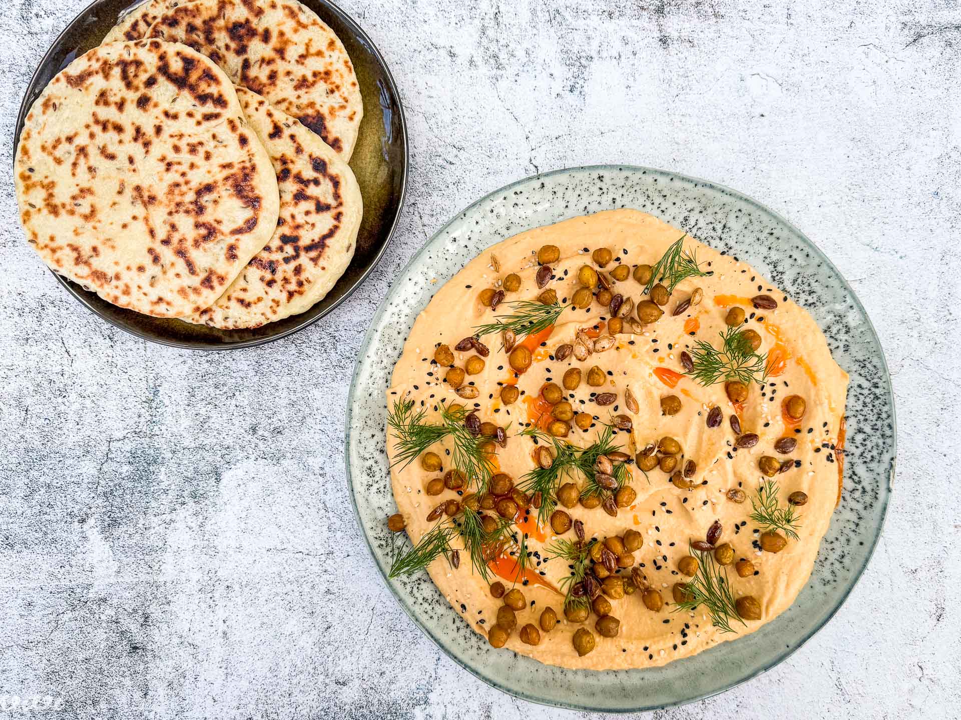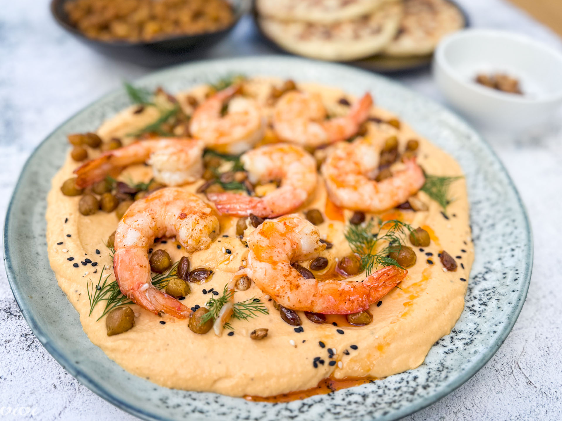 Torej, le humus, le namaz, le hladno za kosilo … Predlog vam, seveda, ni všeč. Toda, če poskusite, boste videli, da ni dolgočasen! Prav nasprotno, toliko plasti okusov, ki se povežejo, ko odtrgamo kos naana in z njim globoko zajamemo po humusu, je doživetje nadokusne preprostosti. Seveda pa tudi kozice pomagajo....