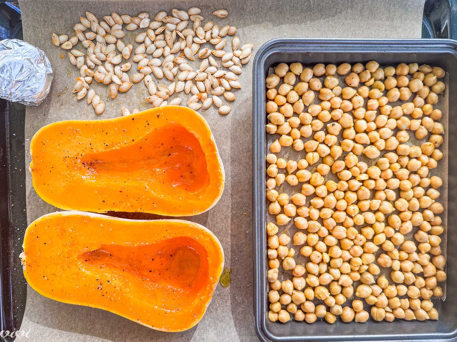 Po dolgem razpolovljeno bučo položimo na drugi pekač. Izdolbemo seemena in jih porazdelimo po pekaču. Bučo in semena premažemo z dvema žlicama olja ter solimo in popramo. Česen zavijemo v folijo in ga položimo na pekač z bučo.