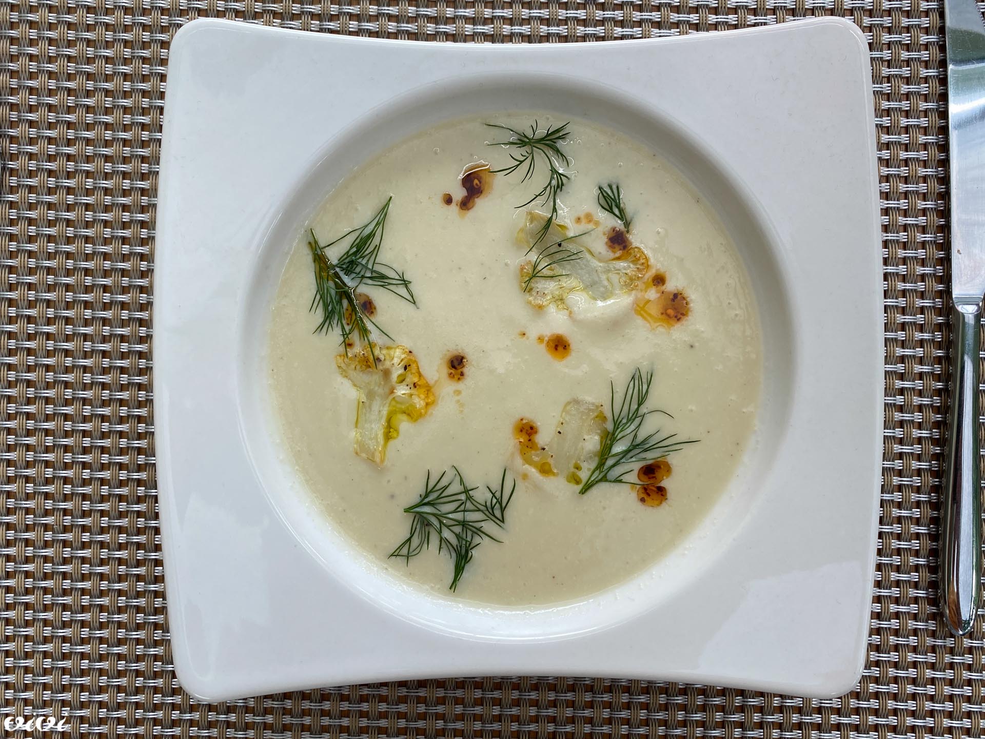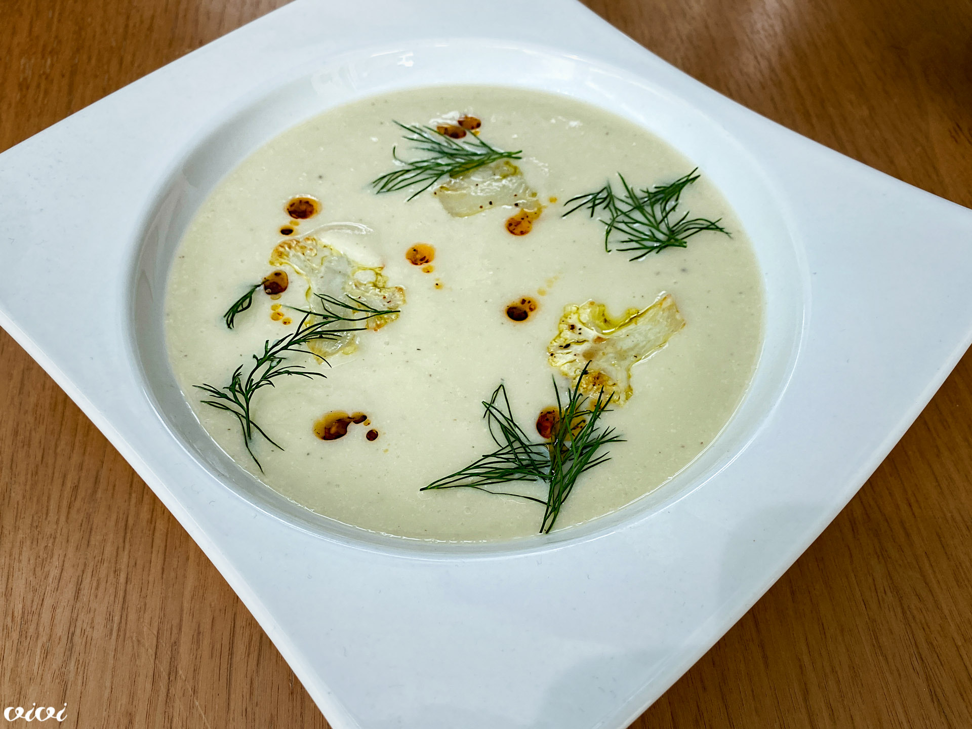 Juho gladko zmiksamo v blenderju in jo precedimo. Začinimo jo s soljo, sveže mletim poprom, muškatnim oreščkom in limonovim sokom. Na krožniku juho potresemo z dušeno cvetačo in pokapljamo s čilijevim oljem. Okrasimo z lističi kopra.