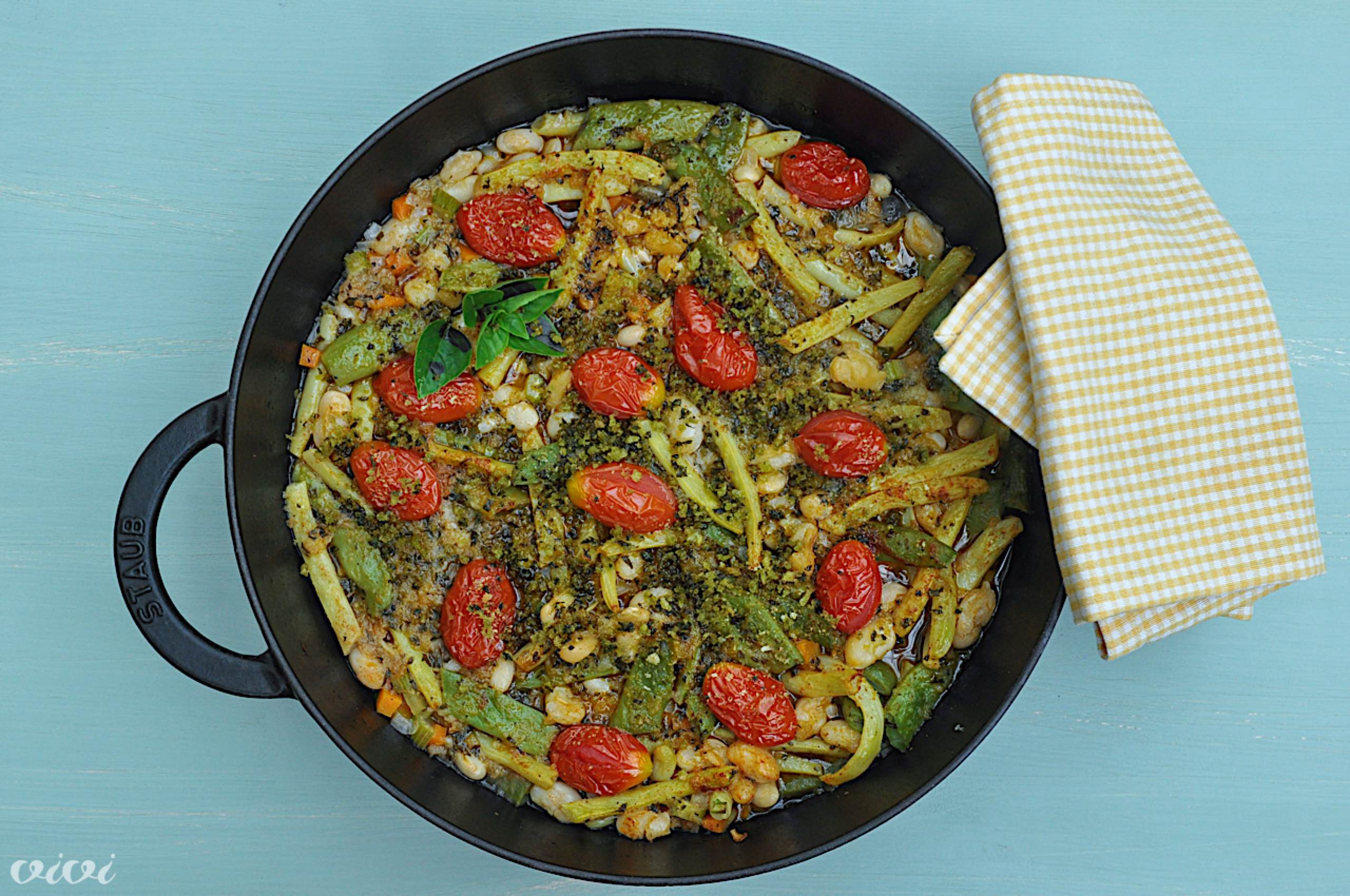 Začinimo s papriko v prahu, kajenskim poprom in soljo ter po vrhu potresemo še paradižnike. Potresemo s polovico bazilikinih drobtin in postavimo na spodnjo rešetko za 25 minut.