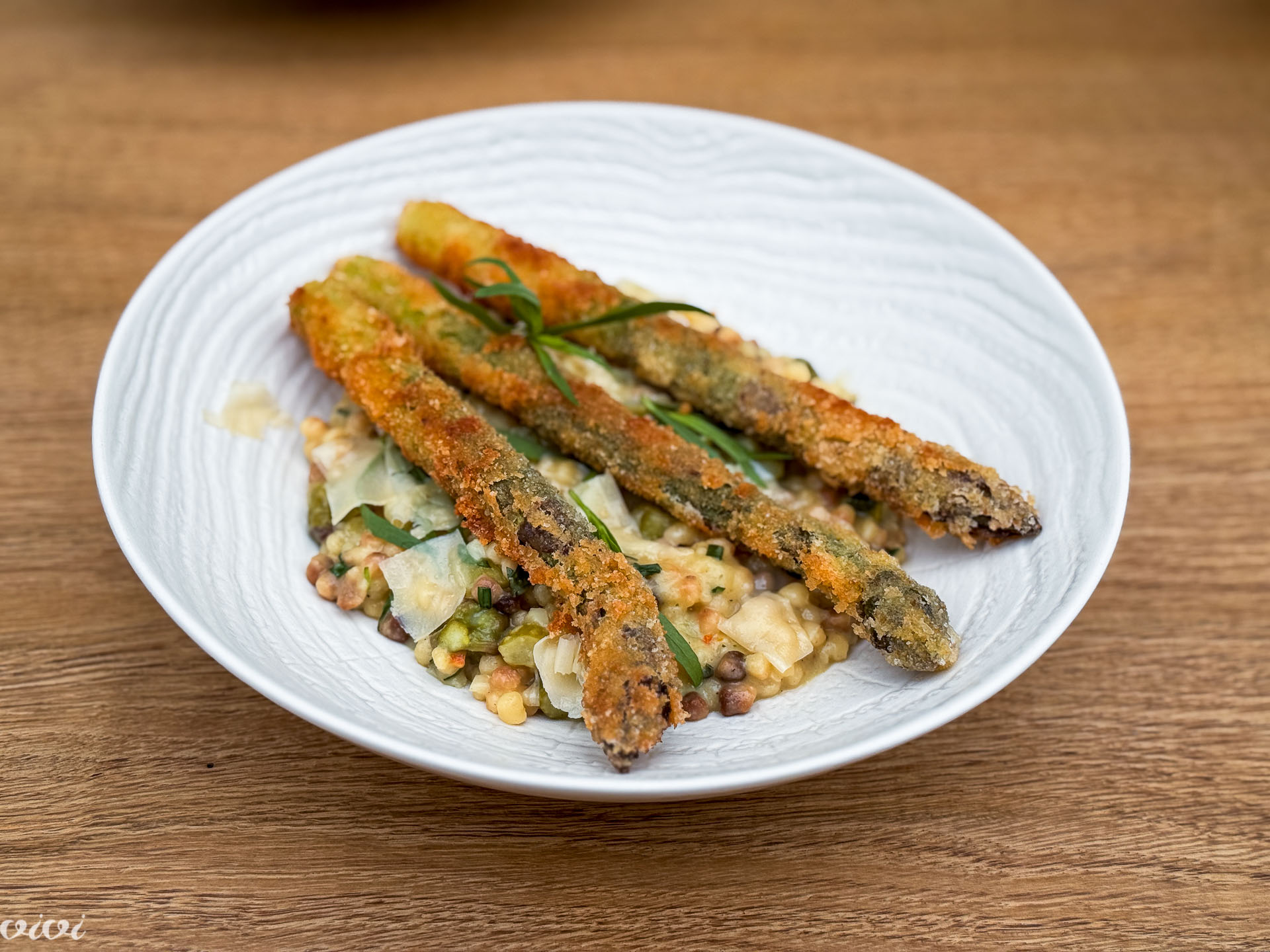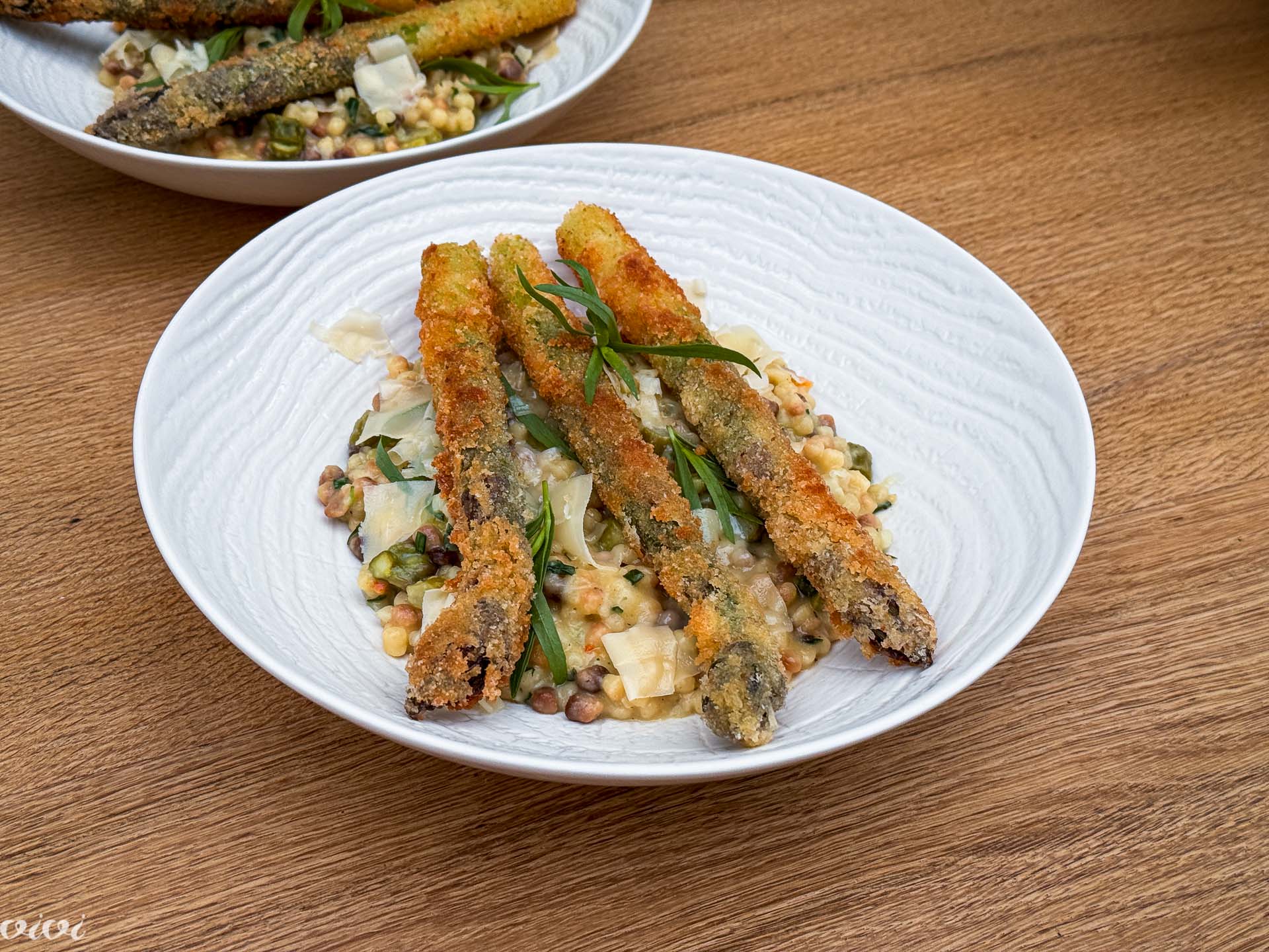 Ko je čas špargljev, se jih ne nasitimo. A le, če imamo zanje dovolj receptov! Tokrat smo jih dodali freguli (po slovensko z u, po italijansko z o, fregola), ki smo jo skuhali ”rižotno”. Ker pa se nam je zdelo to prelahko – pa še najlepše zelene šparglje je bilo škoda vrniti v hladilnik -, smo freguli najdebelejše še ocvrli. Oreškavost pražene testenine je med hrustanjem panade še bolj poskočila.