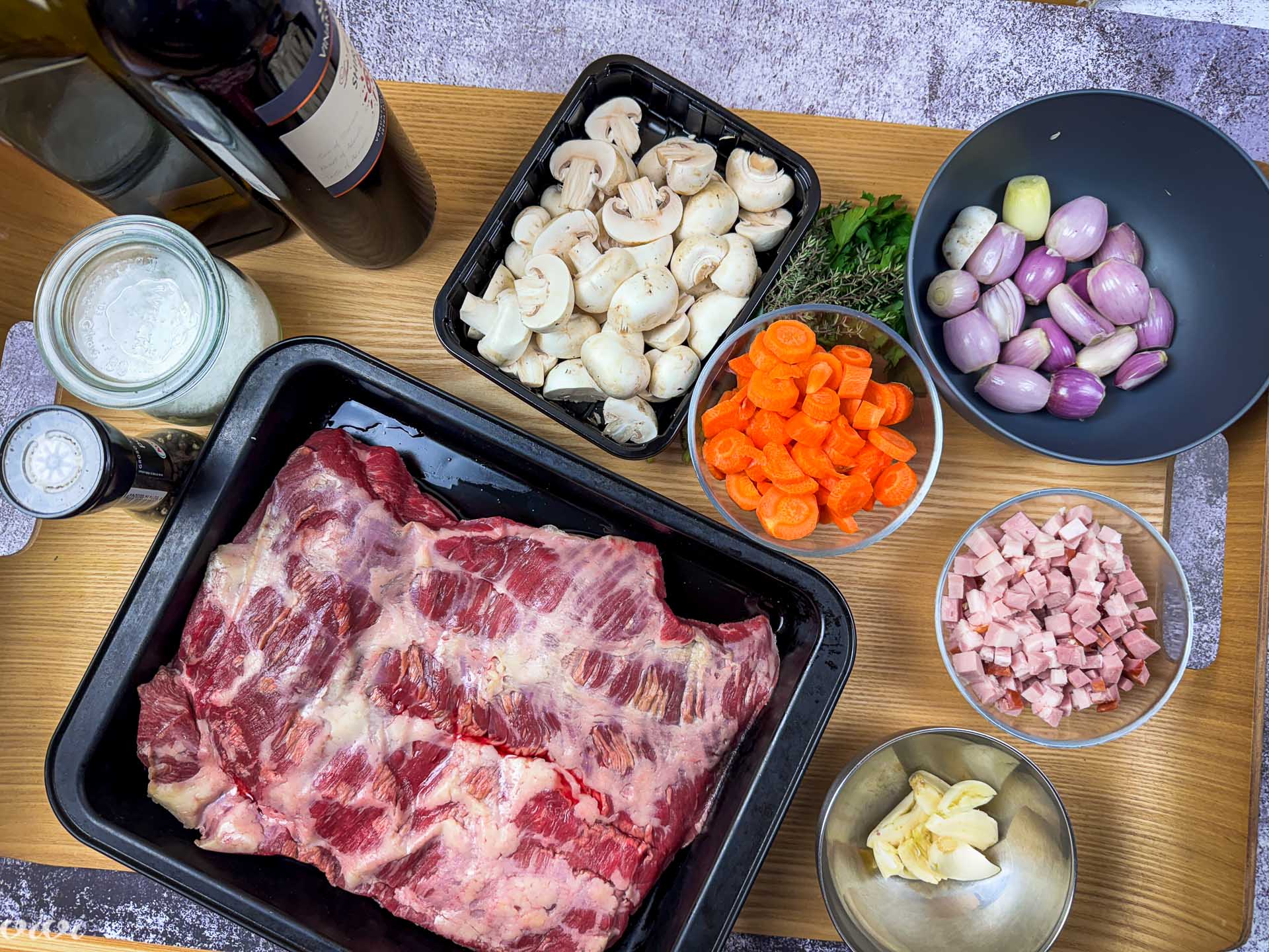 Slanino narežemo na majhne kocke. Šampinjone očistimo in razpolovimo. Olupljeno korenje narežemo na majhne kocke. Česen olupimo in sploščimo z ročajem noža. Šalotke olupimo.