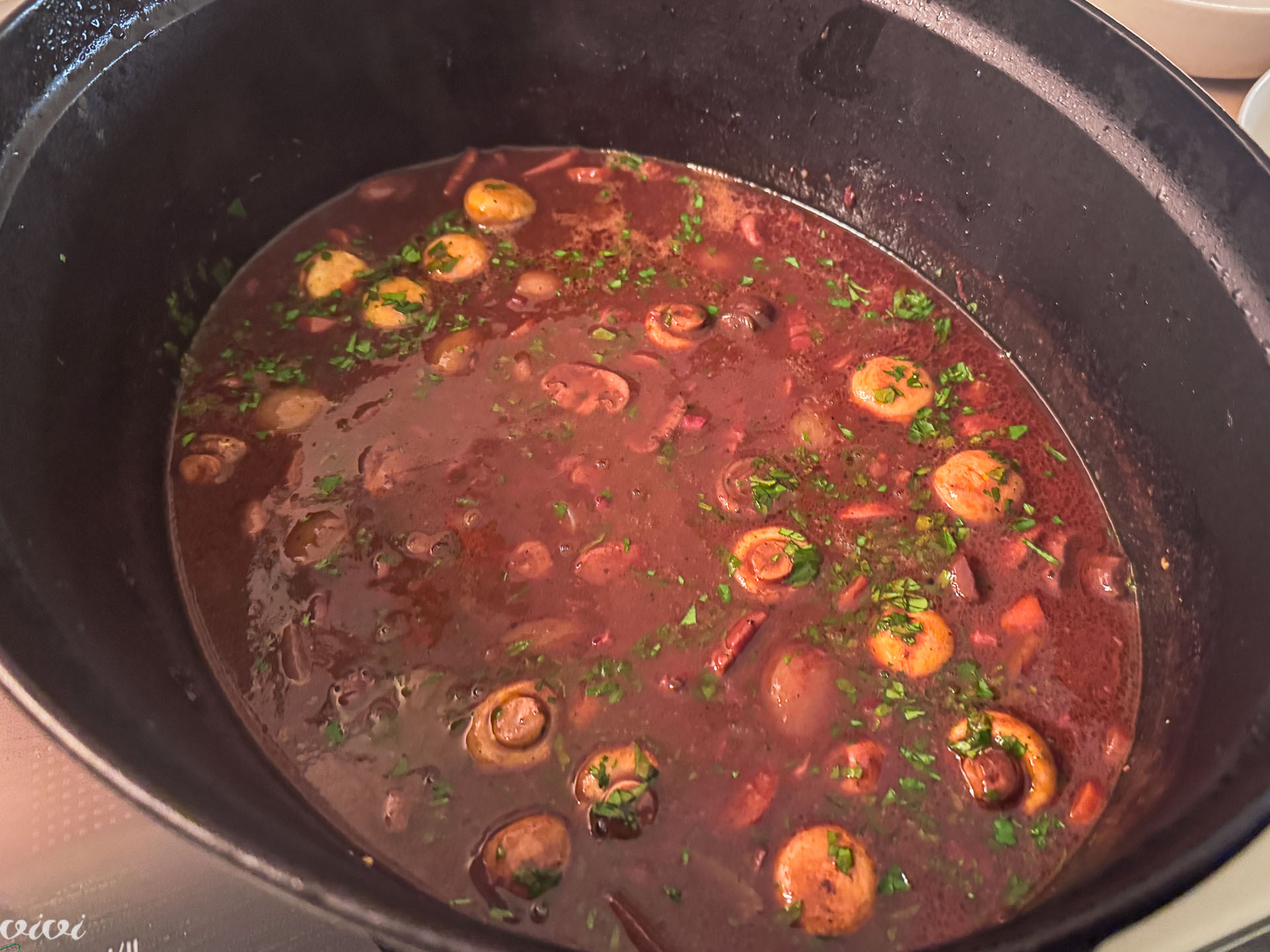 Po koncu dušenja posodo odkrijemo, odstranimo zeliščni šopek in vanjo stresemo slanino in zelenjavo. Odkrito posodo postavimo nazaj v pečico za 30 minut.