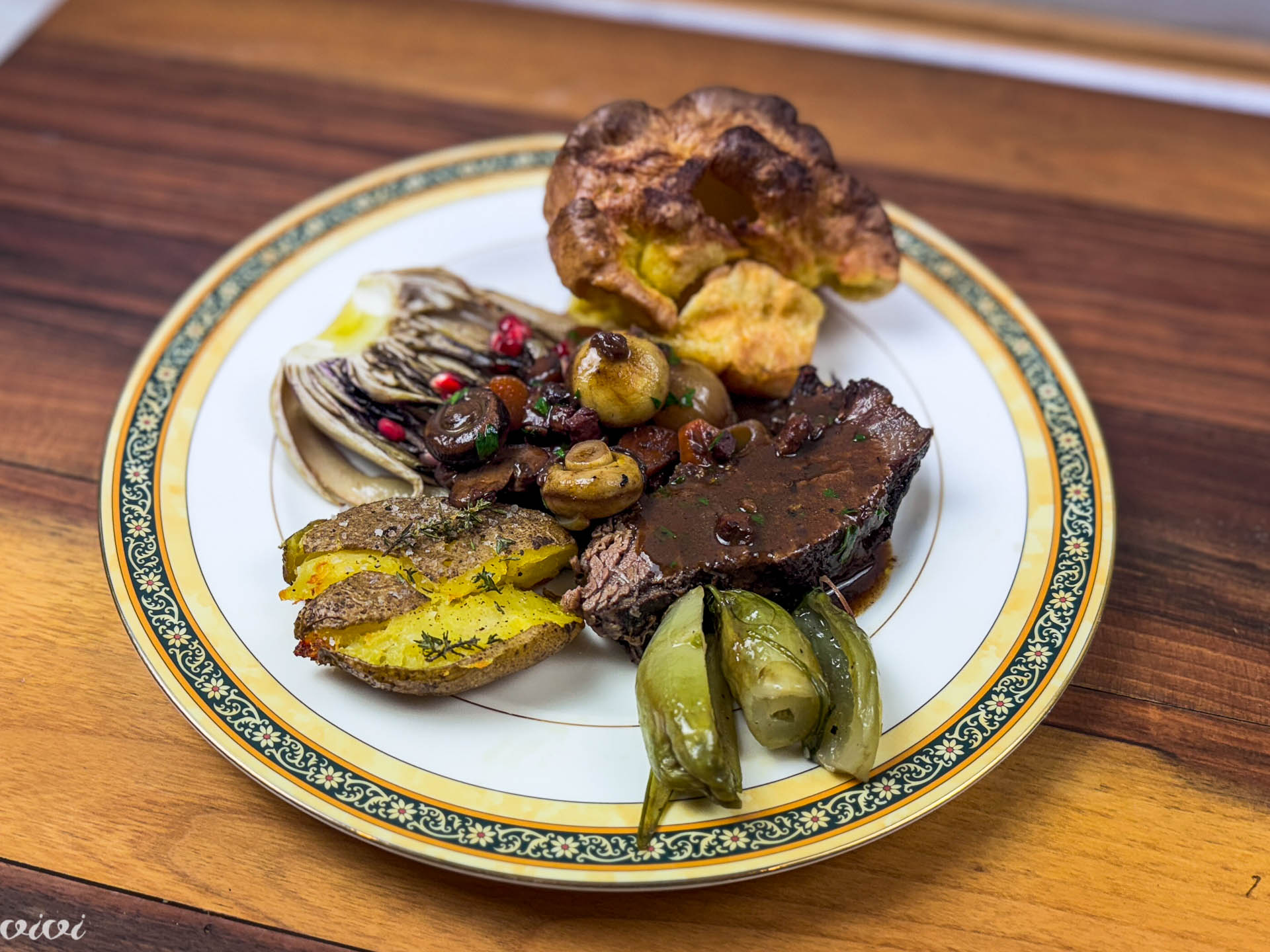 Odlične priloge so potlačen pečeni krompir, yorkshirski puding, dušena puntarella (belušna cikorija) s česnom in oljčnim oljem, pečeni treviški radič z granatnim jabolkom in seveda zelenjava s slanino.