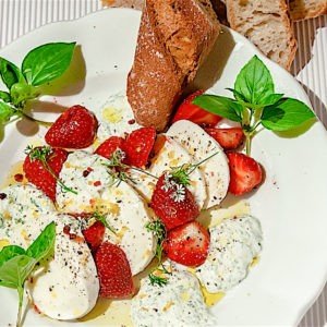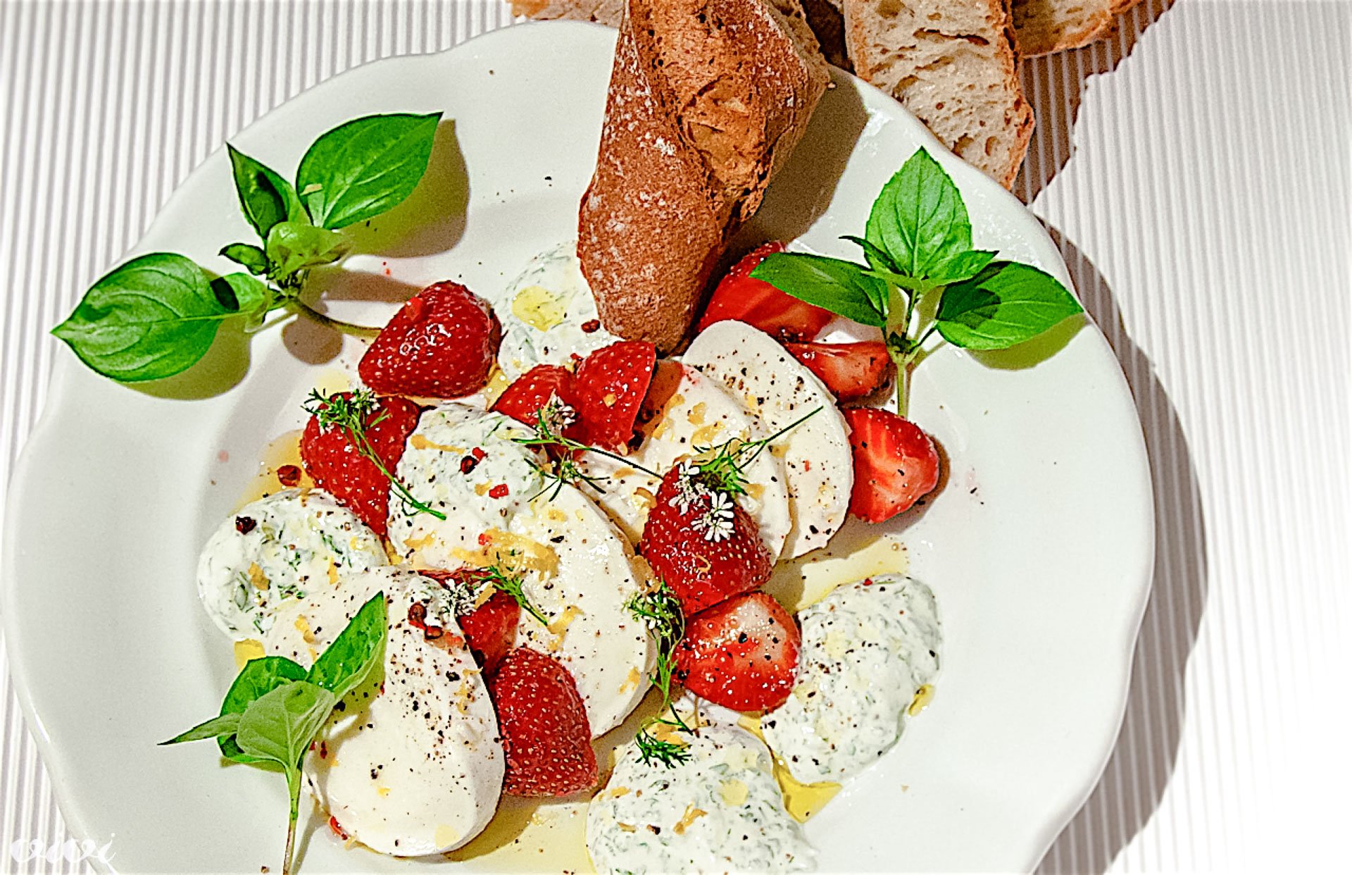 Na krožnike naložimo izmenično mocarelo in jagode ter zeliščno smetano, rahlo solimo in popramo ter pokapljamo z olivnim oljem. Okrasimo z zelišči in zraven ponudimo hrustljavo rustikalno bageto.