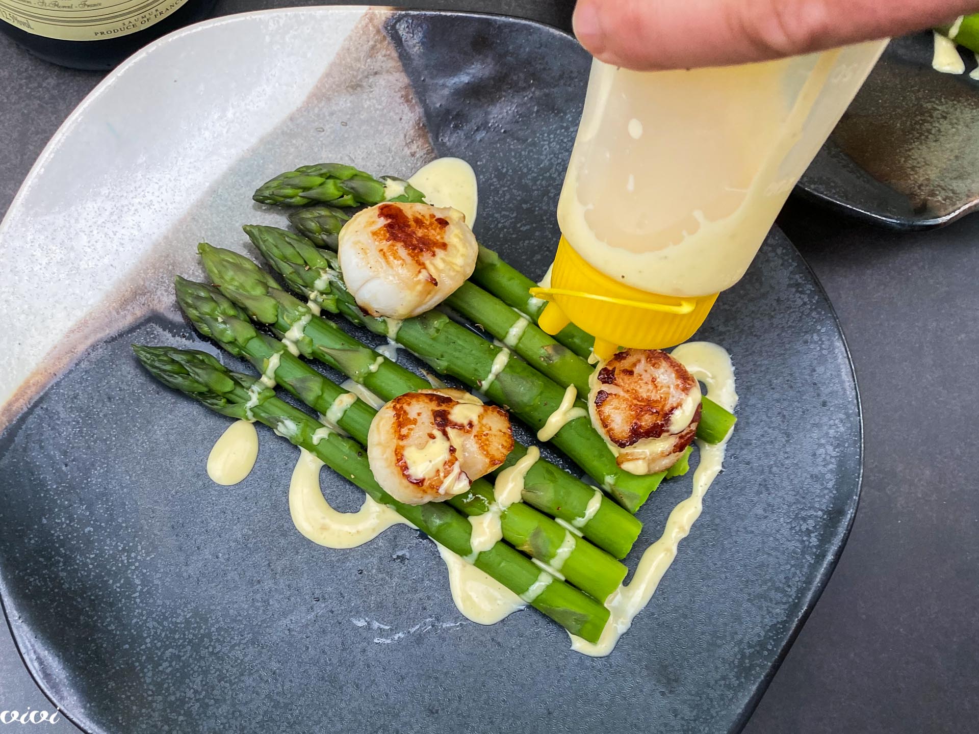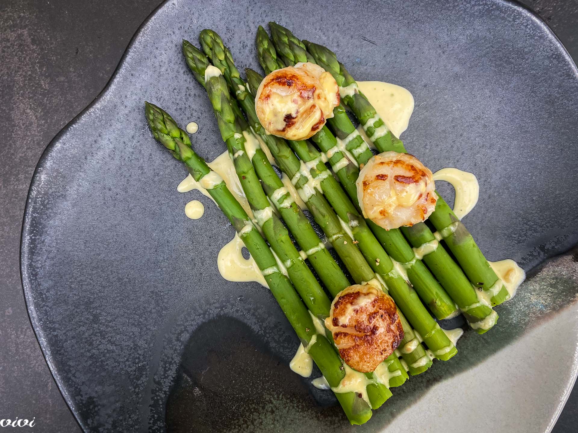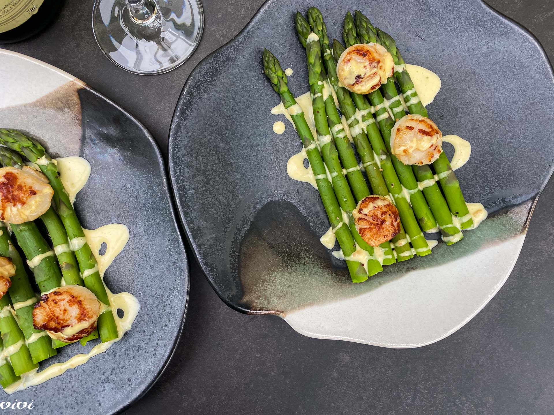 Na krožnike naložimo kuhane šparglje, nanje pečene Jakobove pokrovače in pokapljamo z miso majonezo.