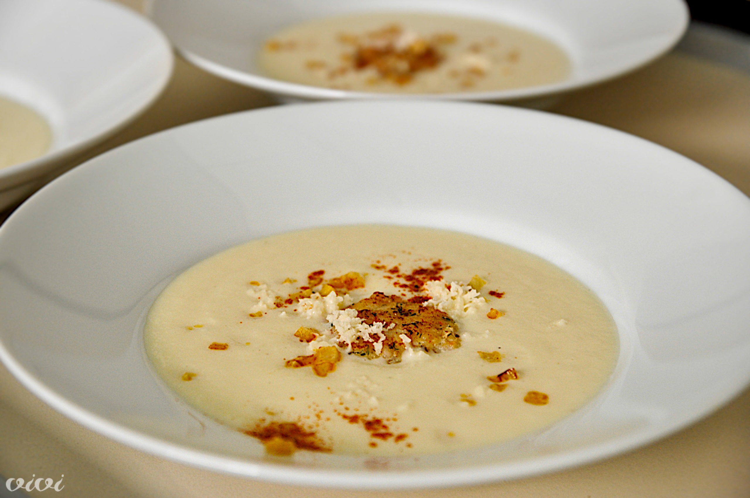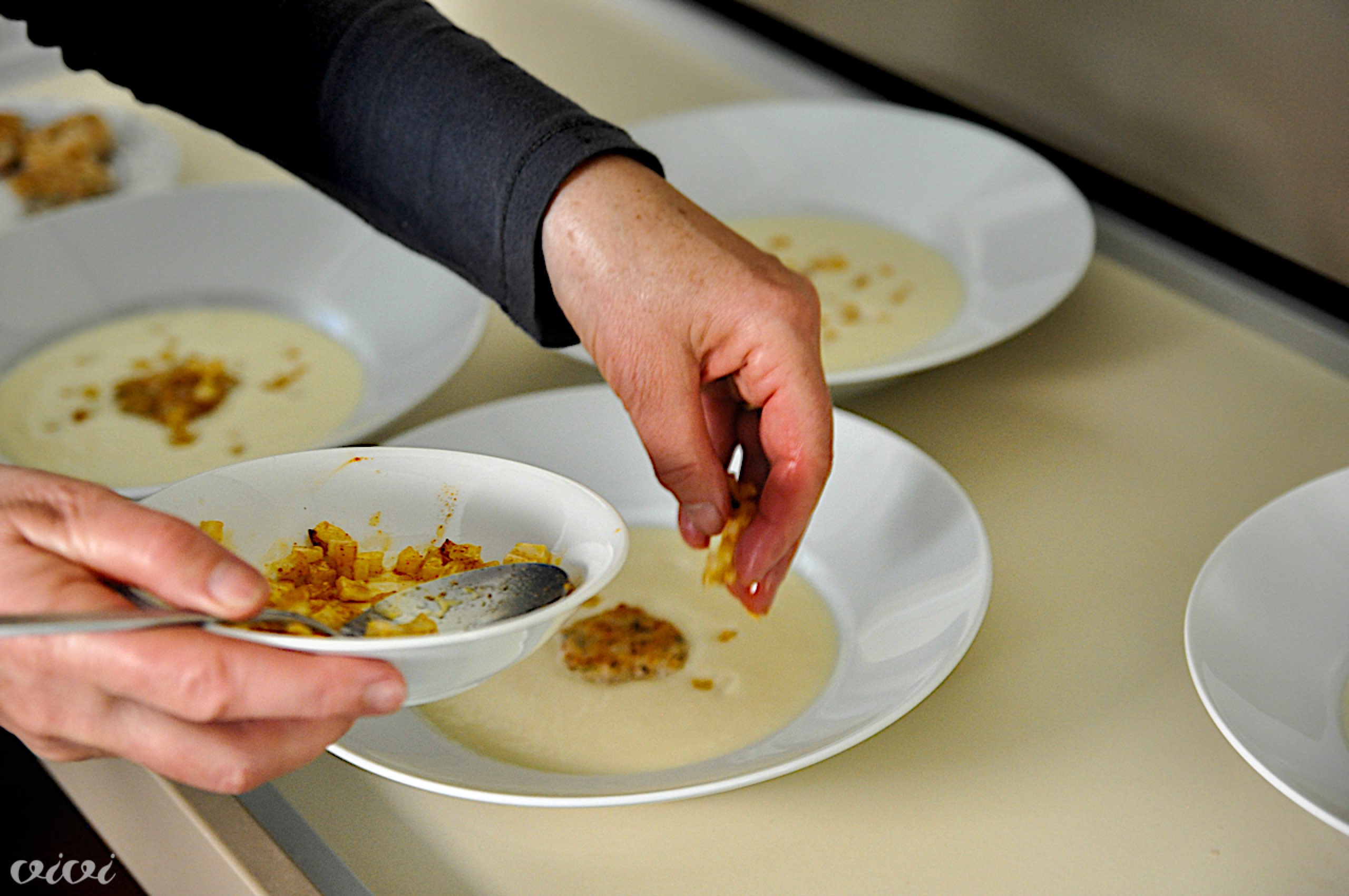 V ogrete krožnike nalijemo juho, vanjo položimo polpete in potresemo s pečenimi kockami zelene, hrenom in ščepcem paprike.