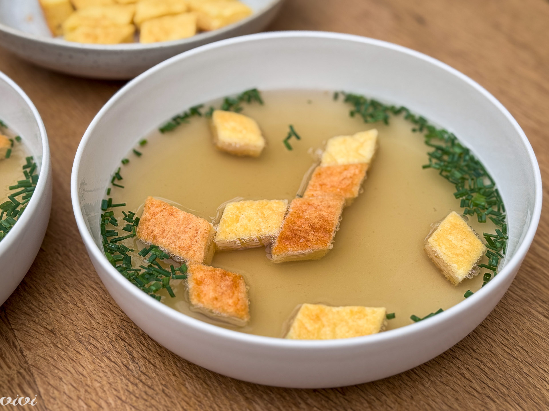 Če skuhamo juho en dan prej, shranimo meso za piščančjo solato, juho precedimo in postavimo na hladno. Naslednji dan z žlico odstranimo plast maščobe na vrhu in juho zavremo.