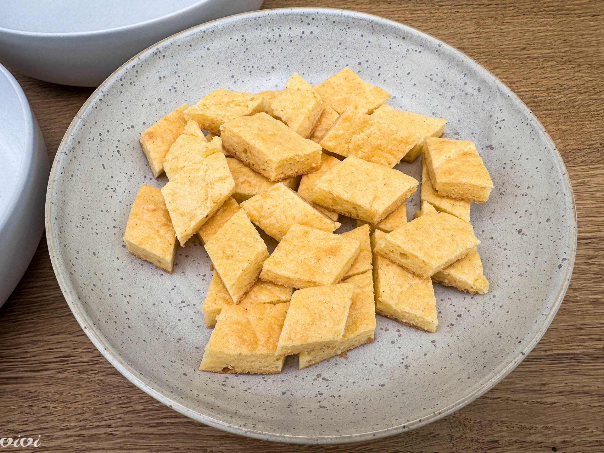 V beljakov sneg s spatulo zamešamo rumenjake. Nato dodamo še moko in parmezan ter vse skupaj previdno premešamo. Začinimo s soljo in muškatnim oreščkom ter vmešamo še stopljeno maslo. Zmes porazdelimo po papirju za peko 2 cm visoko in pečemo v sredini pečice 7 do 9 minut. Ponvičnik ohladimo in narežemo na poljubno velike kose.