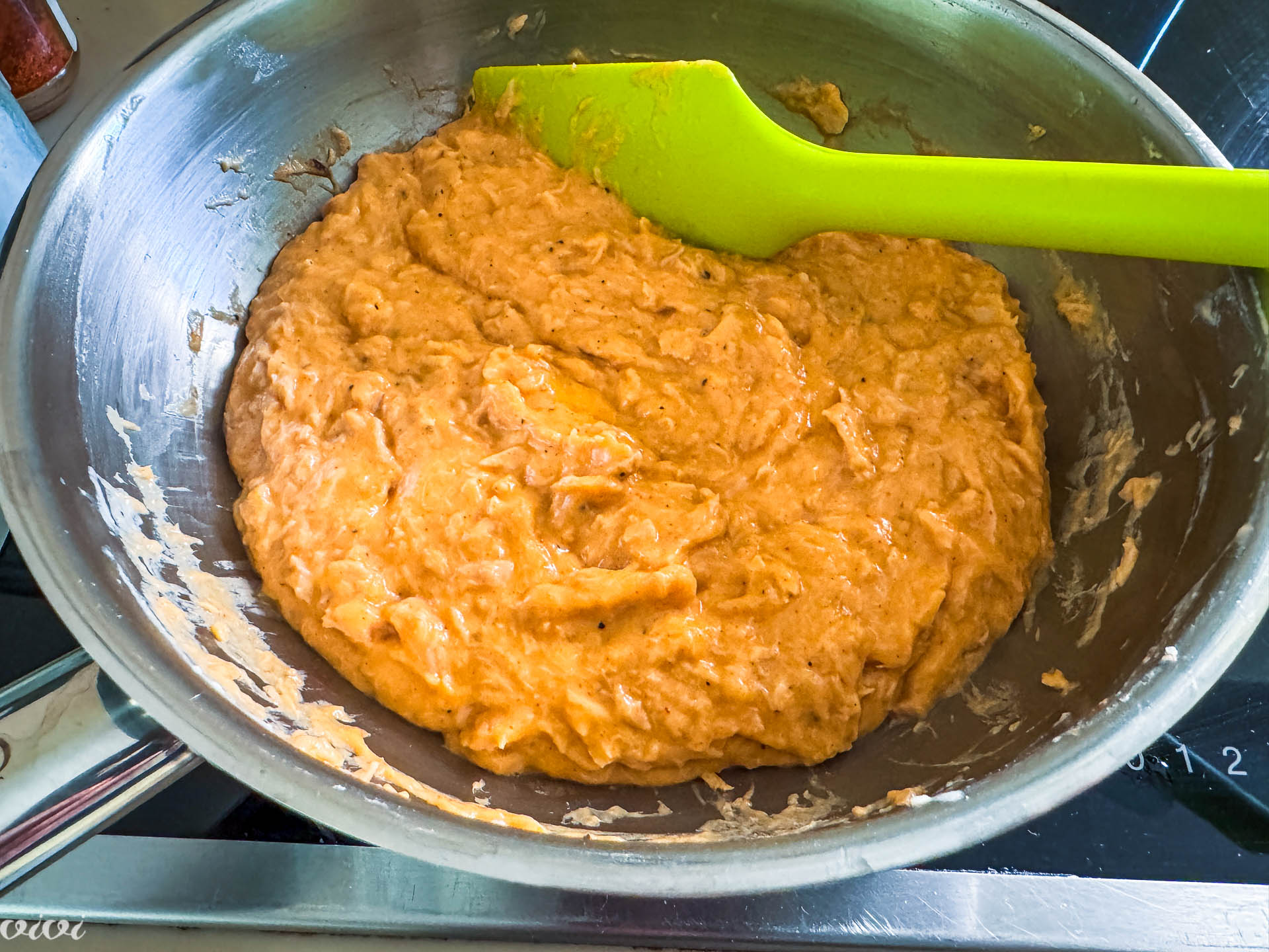 V loncu segrejemo maslo, dodamo moko in rahlo popražimo. Med mešanjem z metlico dolijemo mleko in zavremo, Dodamo dobro odcejeno tuno, tabasco, gochujang pasto, česen, sol in poper. Maso med mešanjem kuhamo na srednji vročini 3 minute. Na koncu vanjo zamešamo koriander in malo limonovega soka. Maso preložimo v skledo in ohladimo. Skledo pokrijemo s prozorno folijo in postavimo v hladilnik za najmanj 2 uri.